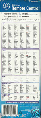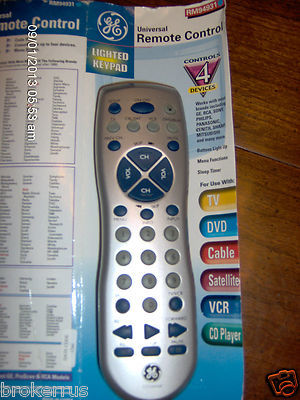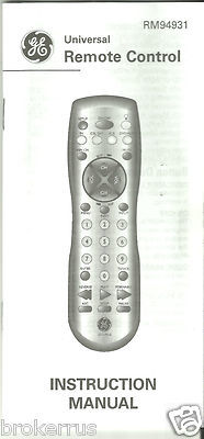FOR SALE IS THIS GENTLY USED GE BRAND UNIVERSAL REMOTE CONTROL MPN RM94931 UPC# 030878949316. VERY LOW MILEAGE AND TESTED PERFECT (each button tested good), THIS UNIT TRAVELED WITH ME FOR HOTEL TELEVISION SETS AND WORKED GREAT ON ANY AND ALL SETS WHEN TRAVELING, LESS THAN 50 HOURS OF USE AND VERY CLEAN. INCLUDES ALL FACTORY DOCUMENTATION TO GET UP AND RUNNING FAST INCLUDING A CODE LIST WITH PROGRAMMING CODES FOR EVERY TELEVISION ON THE PLANET (hundreds of models) AND THIRTY PAGE INSTRUCTION MANUAL. THIS UNIT FEATURES LIGHTED KEYPAD, AND CAN CONTROL FOUR DEVICES. WORKS WITH MOST BRANDS INCLUDING GE, RCA, SONY, PHILIPS, PANASONIC, ZENETH, SHARP, MITSUBISHI AND MANY MORE. BUTTONS LIGHT UP, HAS MENU FUNCTIONS, SLEEP TIMER AND WORK WITH TV, DVD, CABLE, SATELLITE, VCR AND CD PLAYER. NO SETUP REQUIRED FOR MOST GE, PROSCAN AND RCA MODELS. SIMPLY SET-UP WITH CODE SEARCH WHICH SCANS ENTIRE CODE LIBRARY FOR THE RIGHT CODE FOR YOUR EQUIPMENT, CONSOLIDATES UP TO FOUR DEVICES AND FEATURES MENU BUTTON. THE IS THE BEST OF UNIVERSAL REMOTES THAT HAS FEATURES, FUNCTIONALITY AND IS TRULY UNIVERSAL WITH A MYRIAD OF DEVICES. YOU WILL RECEIVE THIS GENTLY USED GE UNIVERSAL REMOTE CONTROL AND ALL MANUFACTURERS DOCUMENTATION SHIPPED BY USPS FIRST CLASS MAIL.....