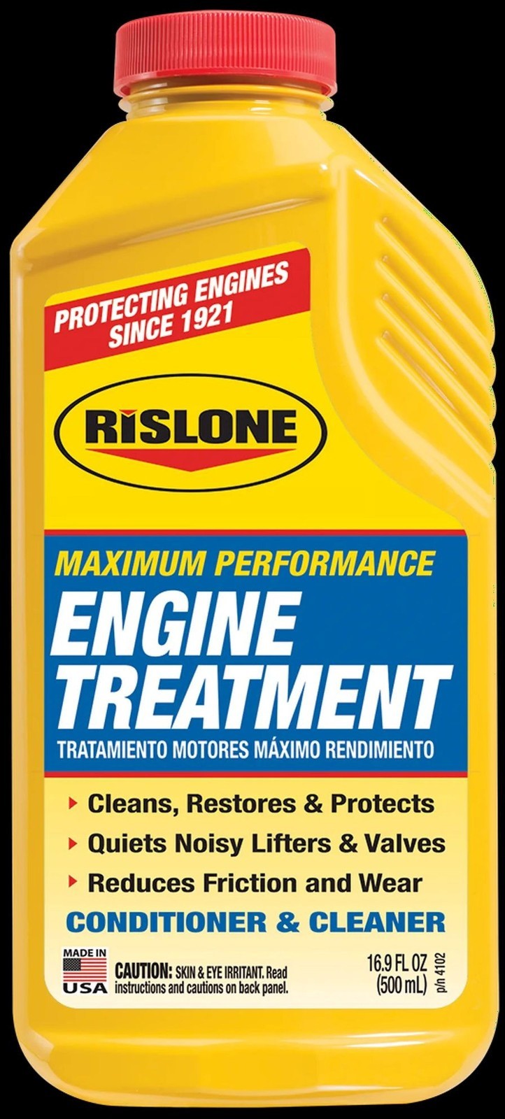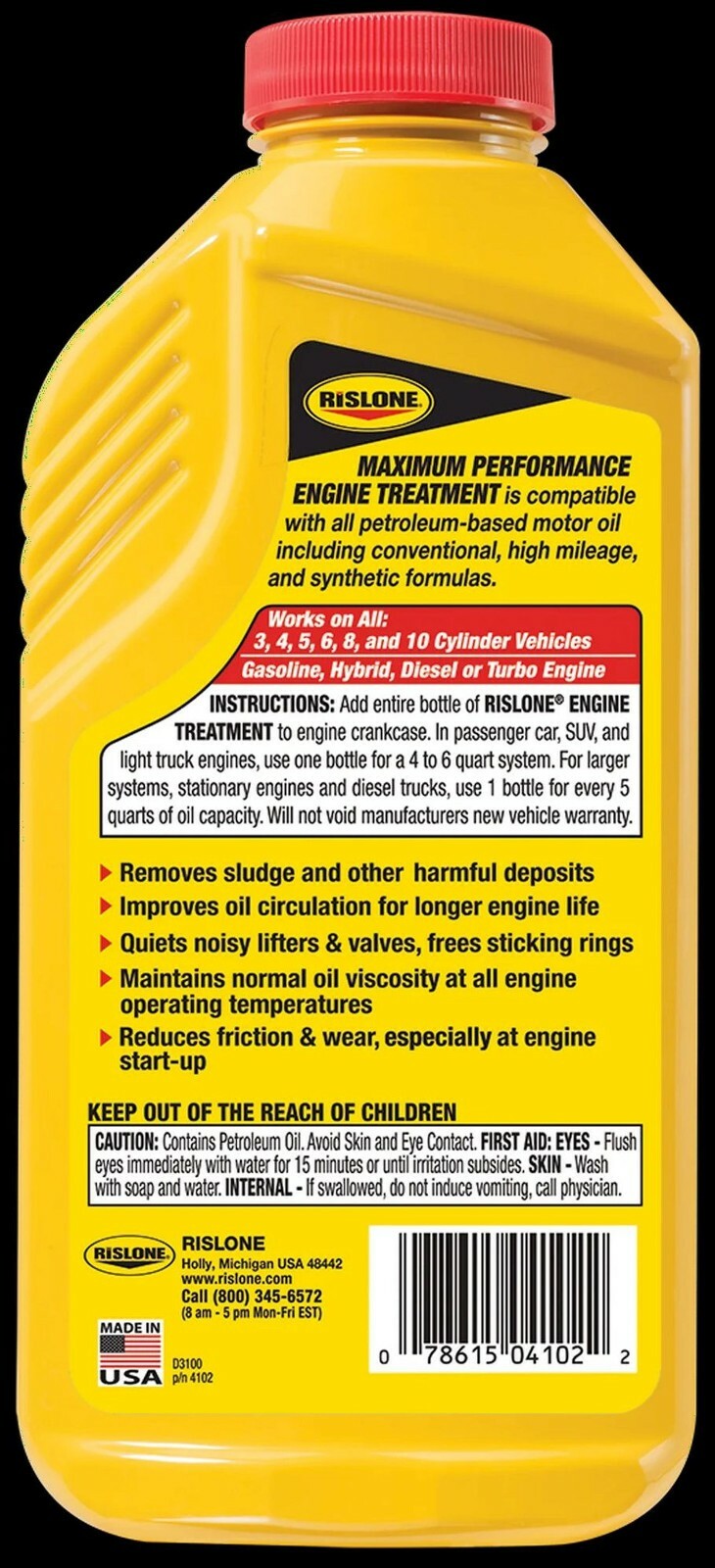 FOR SALE IS ONE (1) NEW BOTTLE OF RISLONE MAXIMUM PERFORMANCE ENGINE TREATMENT OIL TREATMENT 16.9 fluid ounce PLASTIC BOTTLE MANUFACTURED BY RISLONE PRODUCTS MPN 4102 UPC# 078615041022. MADE IN HOLLY, MICHIGAN, USA., SOLD EXACTLY AS PICTURED, ONE (1) BOTTLE PER ORDER. THIS HIGH MILEAGE RISLINE ENGINE TREATMENT IN THE CLASSIC YELLOW BOTTLE REDUCES FRICTION AND WEAR, QUIETS NOISY LIFTERS AND VALVES, REMOVES AND PREVENTS SLUDGE. RISLONE ENGINE TREATMENT FOR YOUR OIL WORKS ON ALL 4, 6, AND 8 CYLINDER VEHICLES, USE ON ANY GASOLINE, DIESEL OR TURBO ENGINES. RISLONE ENGINE TREATMENT CONCENTRATE IS HIGH QUALITY PENETRATING LUBRICATION OIL, COMBINED WITH PROTECTIVE ENGINE ADDITIVES AND SPECIAL CLEANING AGENTS. RISLONE ENGINE TREATMENT IS A CONCENTRATE MULTI GRADE FORMULA THAT ALLOWS THE OIL TO FLOW FREELY AND PROVIDES PROTECTION OVER A BROADER TEMPERATURE RANGE. SLUDGE AND OTHER HARMFUL DEPOSITS WITHIN ENGINES CAN ALTER TOLERANCES, STICK RINGS, CAUSE NOISY VALVES LIFTERS, AND PLUG OIL PASSAGES AND SCREENS. THE UNIQUE RISLONE FORMULA IS DESIGNED TO PENETRATE INTO VALVE SEATS, BEARING SURFACES, PISTON RINGS AND RING GROOVES, WHERE SLUDGE AND VARNISH IS LIKELY TO FORM. THESE DEPOSITS ARE GRADUALLY REMOVED AND HELD IN SUSPENSION UNTIL THEY ARE TRAPPED IN THE FILTER OR REMOVED WITH THE NEXT OIL CHANGE. REGULAR USE OF RISLONE ENGINE TREATMENT, WITH OIL AND FILTER CHANGES AT THE PROPER INTERVALS, WILL KEEP SUCH DEPOSITS TO A MINIMUM. A CLEANER ENGINE IS A BETTER LUBRICATED ENGINE WITH LESS FRICTION WEAR. SINCE 1921, ALL RISLONE PRODUCTS ARE PROUDLY MADE IN THE USA. YOU WILL RECEIVE ONE (1) RISLONE MAXIMUM PERFORMANCE ENGINE TREATMENT OIL TREATMENT 16.9 fluid ounce BOTTLE, EXACTLY AS PICTURED, SHIPPED BY USPS.....