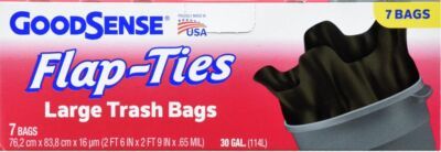 FOR SALE IS 14 NEW LARGE 30 gallon TRASH BAGS WITH FLAP TIES (2 boxes with 7 bags in each box) BY GoodSense BRAND MPN GDS36FT8E UPC# 029900212900. TWO (2) BOXES OF SEVEN (7) LARGE BLACK PLASTIC TRASH BAGS ARE INCLUDED IN THIS SALE TOTAL 14 BAGS, BLACK color PLASTIC, 30 gallon CAPACITY, 33" tall x 30" wide x .65 mil thick, DURABLE, AND PERFECT FOR THE LARGER KITCHEN TRASH CAN, or FOR LEAF AND YARD REFUSE, BLACK COLOR, DIMENSIONS ARE 33" TALL x 30" WIDE x .65mil thick. EASY TO REMOVE FROM YOUR RECEPTACLE, FEATURES CONVENIENT FLAP TIES ON TOP THAT ALLOW FOR SIMPLE FOUR-WAY TIE CLOSURE TO CINCH or TIE BAG CLOSED FOR EASY DISPOSAL. THESE BAGS ARE NOT SUPER THICK FOR CONSTRUCTION REFUSE, BUT WORK GREAT AROUND MY HOME AND YARD FOR GENERAL USE. THE FLAP TIES MAKE SECURING YOUR 30 gallon BAG QUICK AND EASY. MADE IN PEABODY MASSACHUSETTS USA BY WEBSTER, A DIVISION OF AEP INDUSTRIES. YOU WILL RECEIVE TWO BOXES OF 7 BAGS PER BOX TOTAL 14 BAGS 30 GALLON FLAP TIE BLACK TRASH BAGS SHIPPED BY USPS.....