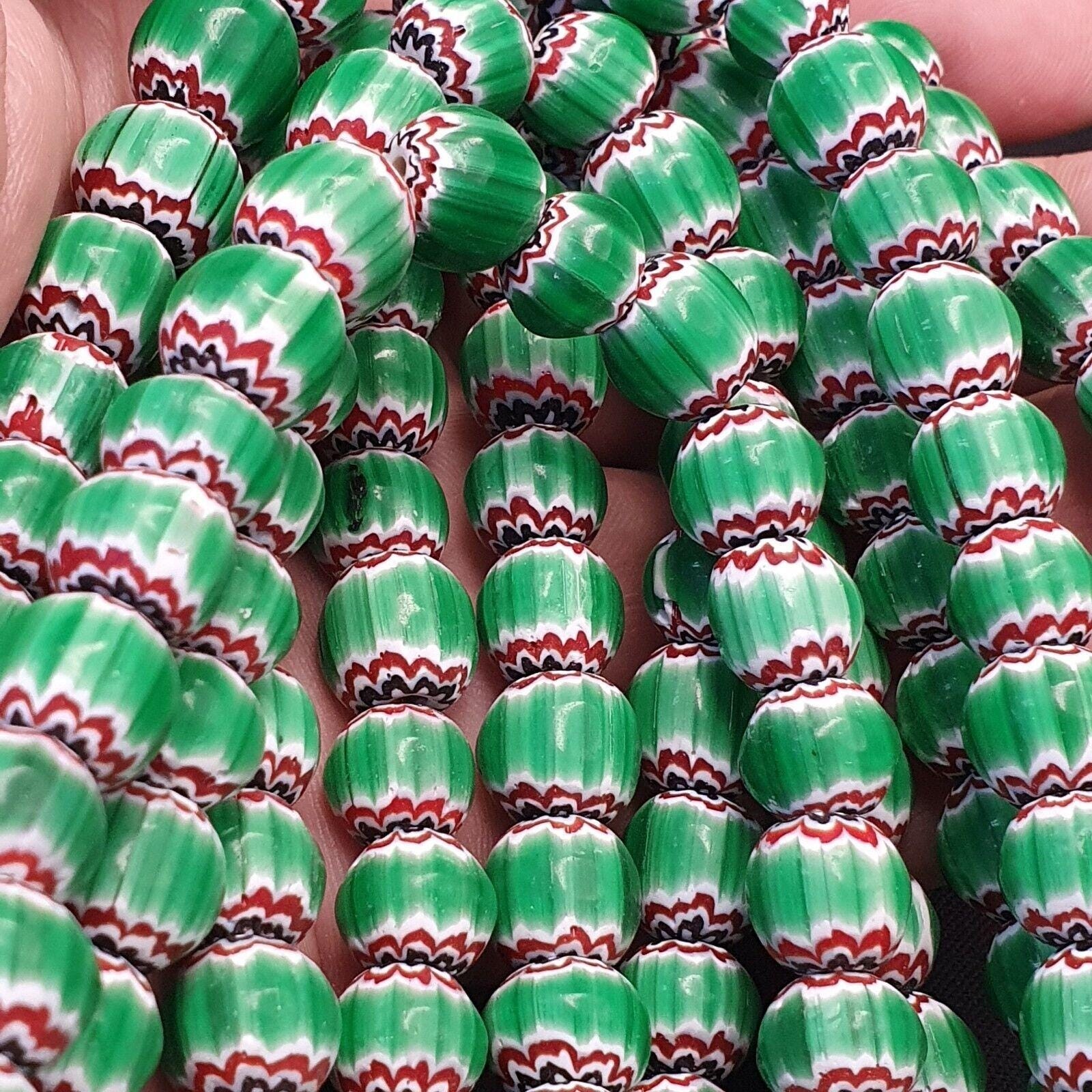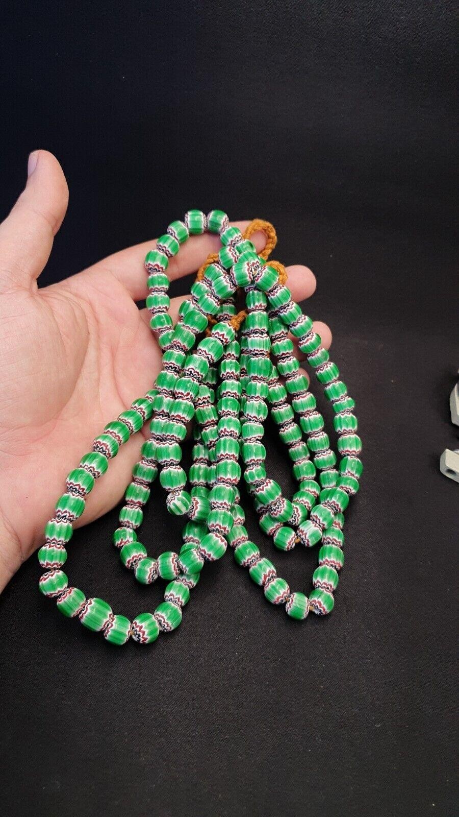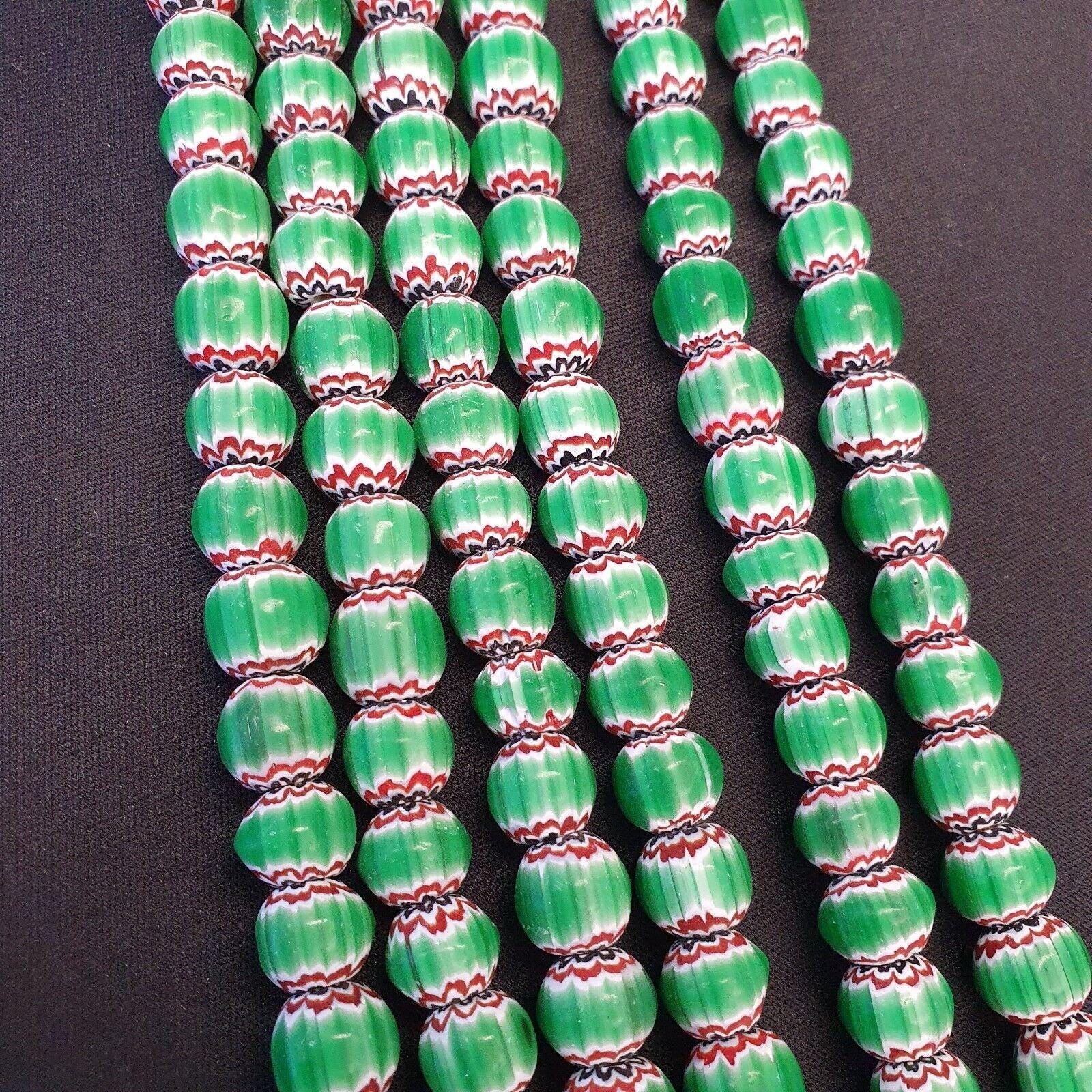 Vintage venetian african style green glass chevron 10mm beads long strandGift