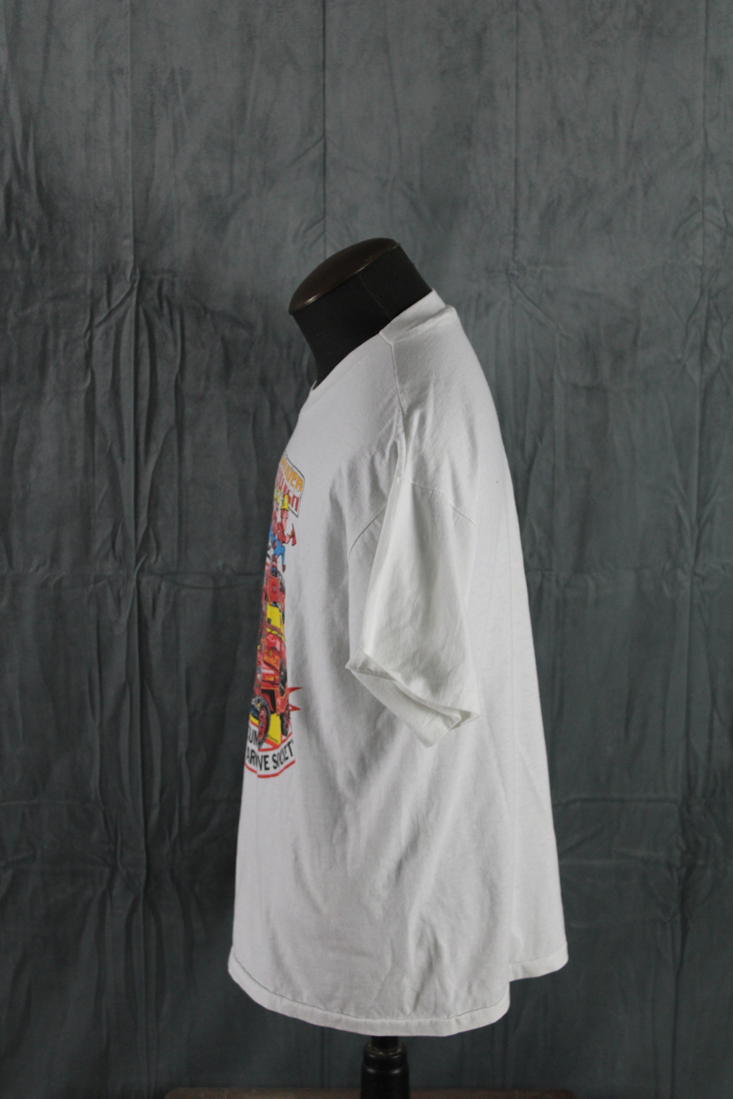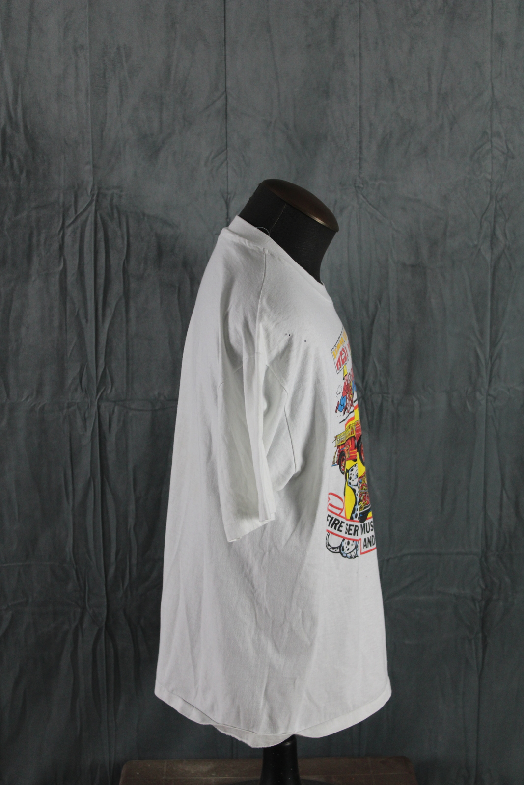 Up for sale is a vintage graphic t-shirt. It has a white base colour with a cartoon graphic of firemen and fire trucks for the West Vancouver Fire Museum screened on the chest. What a great vintage shirt, do not miss out on it.