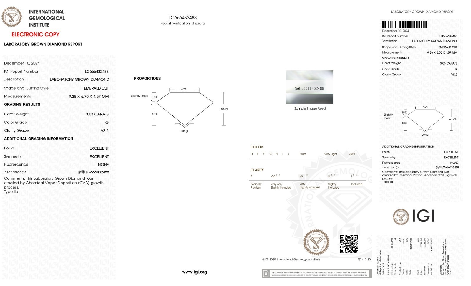 Terms Conditions:Kindly keep this in mind before making your purchase that we are selling our Lab grown diamonds on multiple platforms. The Diamond you receive will be exact color, clarity and cut. The only difference could be the IGI certificate which might differ from the listed stone. We highly appreciate your cooperation.LabIGIReport #-ShapeEmeraldCarat1.81ColorGClarityVS2Cut-PolishExcellentSymExcellentFluorNoneLocationNew York, United StatesDepth68.1%Table63%GirdleMediumCrown13.5%, 33.6Pavillion51.5%, 40.0CuletLargeMeas8.44 x 5.65 x 3.85Ratio1.49BGMNoneGrowth TypeCVDPlease note that we are listing all of our stone's color clarity grade as per IGI Lab Report. IGI Lab is the 2nd most reputable trustworthy Lab after GIA. Every person can have a different opinion about the color clarity of the stone. So the stones you are getting can be one or two grades lower in color clarity grade as per GIA standards but as IGI standards those are as mentioned in the listing. So the stones you are getting can be g to i in color vs2 to si2 in clarity grades as per GIA standards but as IGI standards those are as mentioned in the listing. how practical it is to use $75000 (3 Carat E VS!) Natural Diamond stone standard for the same color clarity grade (3 Carat EVS1) Lab Grown Stone which you are getting for $750. My advice to you is whatever authenticity says please please get the stone if you do not like then I will accept the return without any question in the next 30 days of purchase. I don't want you to miss the great opportunity to buy those beautiful lab grown stones which are 100% the same chemical other properties wise as natural Diamonds at 1% of price compared to Natural Diamond.
