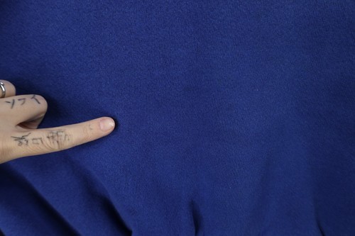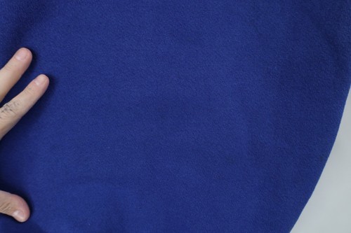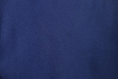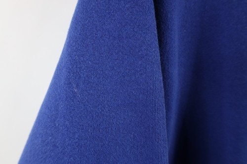 Stains/dark spots front. Blemishes arms. Collar, cuffs, bottom discolored. Color faded. Pilling. Made in USA