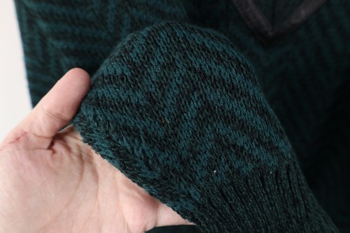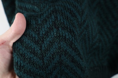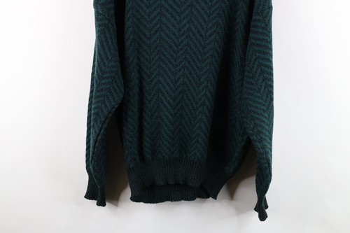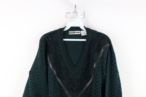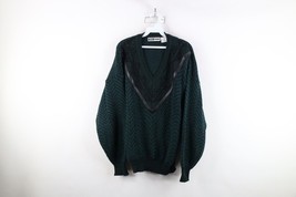 Vintage 90s Dapper Mens Large Leather Trim Herringbone Knit V-Neck Sweater Green