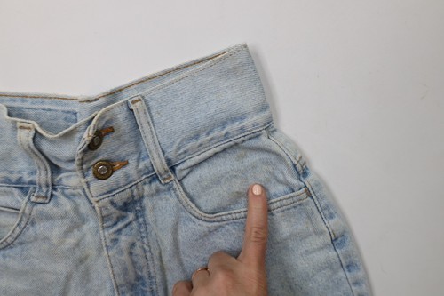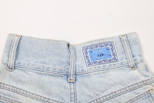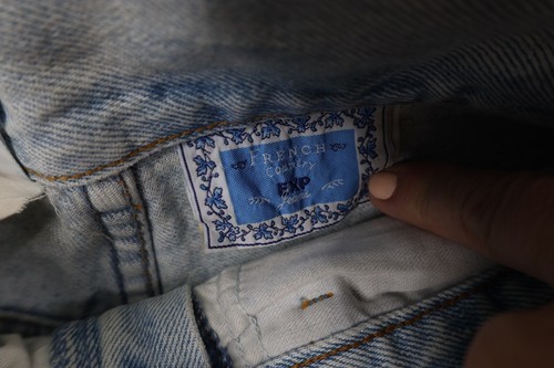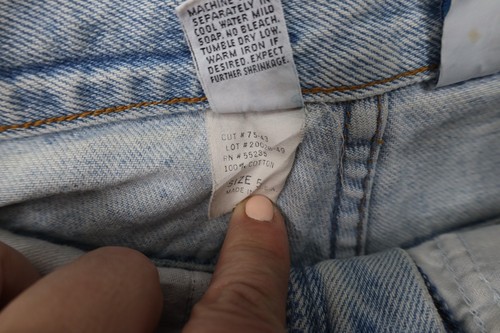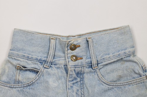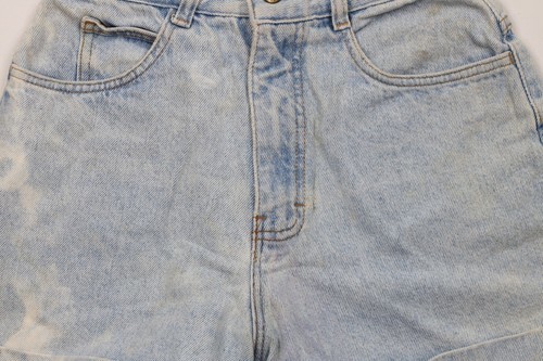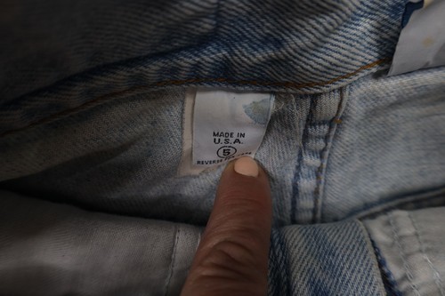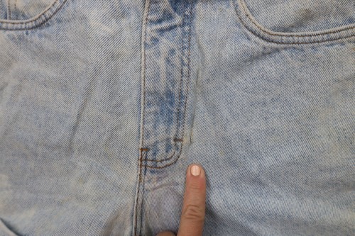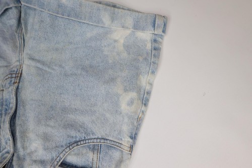 Threadbare spot near the front waist fly. Bleach blemishes right leg. Blemishes front and back. Distressed and faded. USA made
