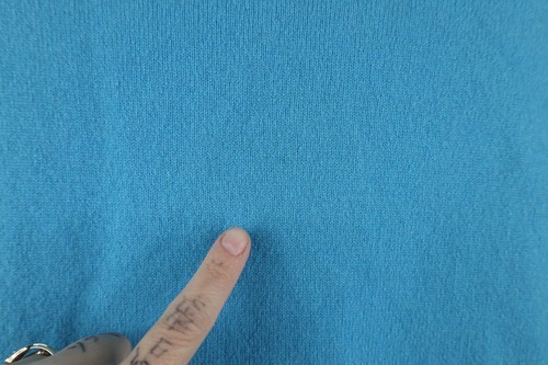 Hole right sleeve. Blemishes front, back. Bottom hem, cuffs curled. Color faded. Pilling