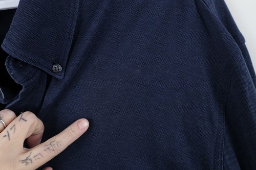 Blemishes front top, back top. Stains arms. Collar, cuffs discolored. Color faded. Pilling