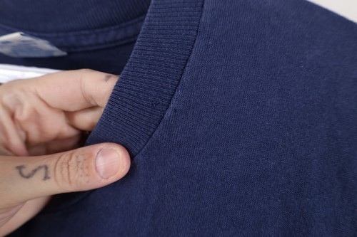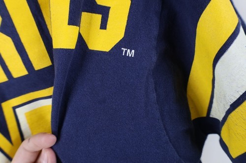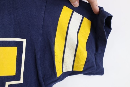 Fabric pulls, loose threads bottom hem. Stains back. Hole collar. Graphics blemished/cracking, faded. Blemishes front, shoulders, collar/inner collar, back top. Collar, arms discolored. Color faded. Pilling. Made in USA