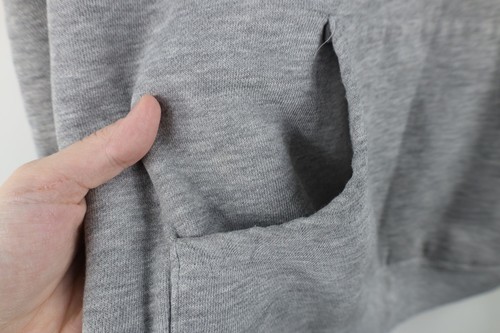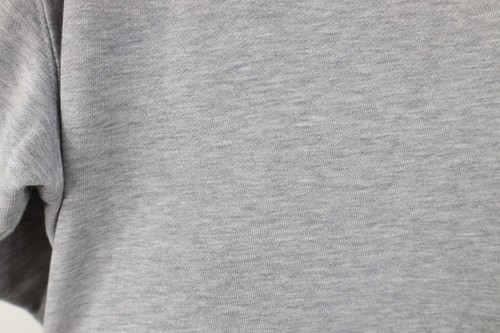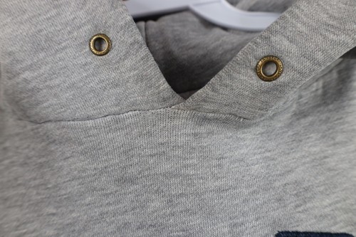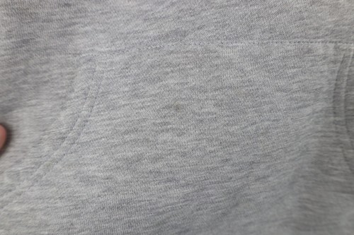 Stains left arm, hood. Blemishes/dark spots throughout. Loose thread left cuff. Hood, cuffs discolored. Missing string. Loose thread tag. Color faded. Pilling. Front of hood loose