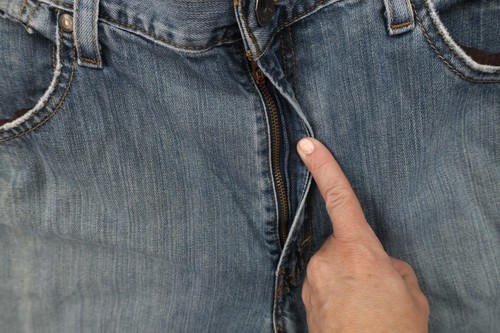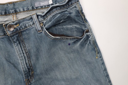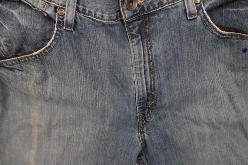 Marker stain upper left. Cuffs, front middle and waistband have fraying