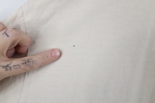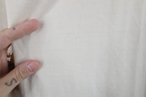 Hole back top. Blemishes front, shoulders, collar/inner collar, back. Collar, arms discolored. Color faded. Pilling. Tag ripped