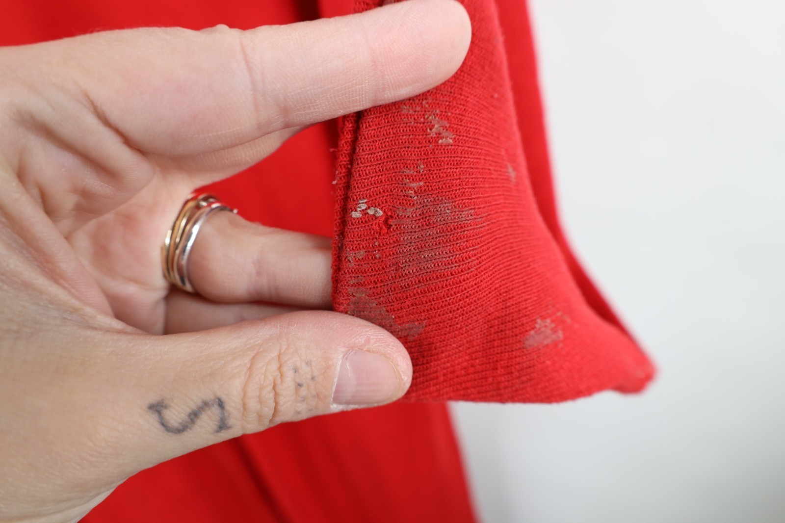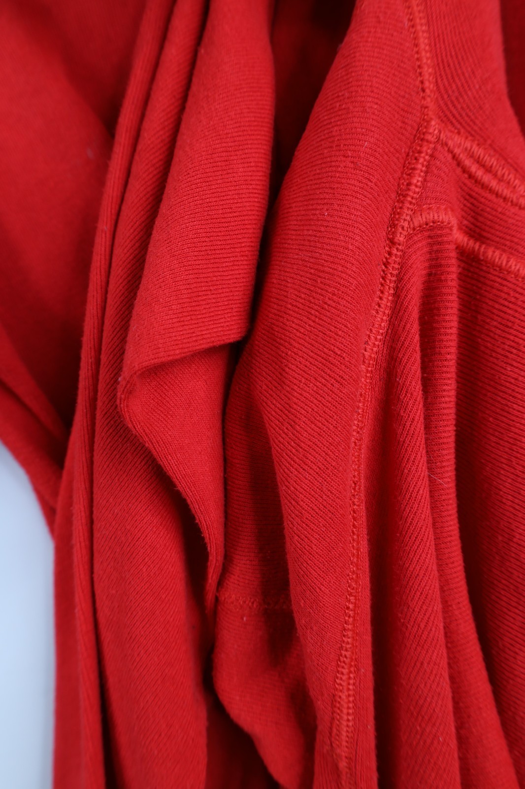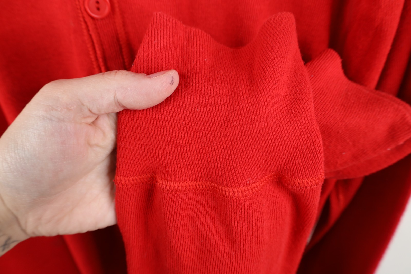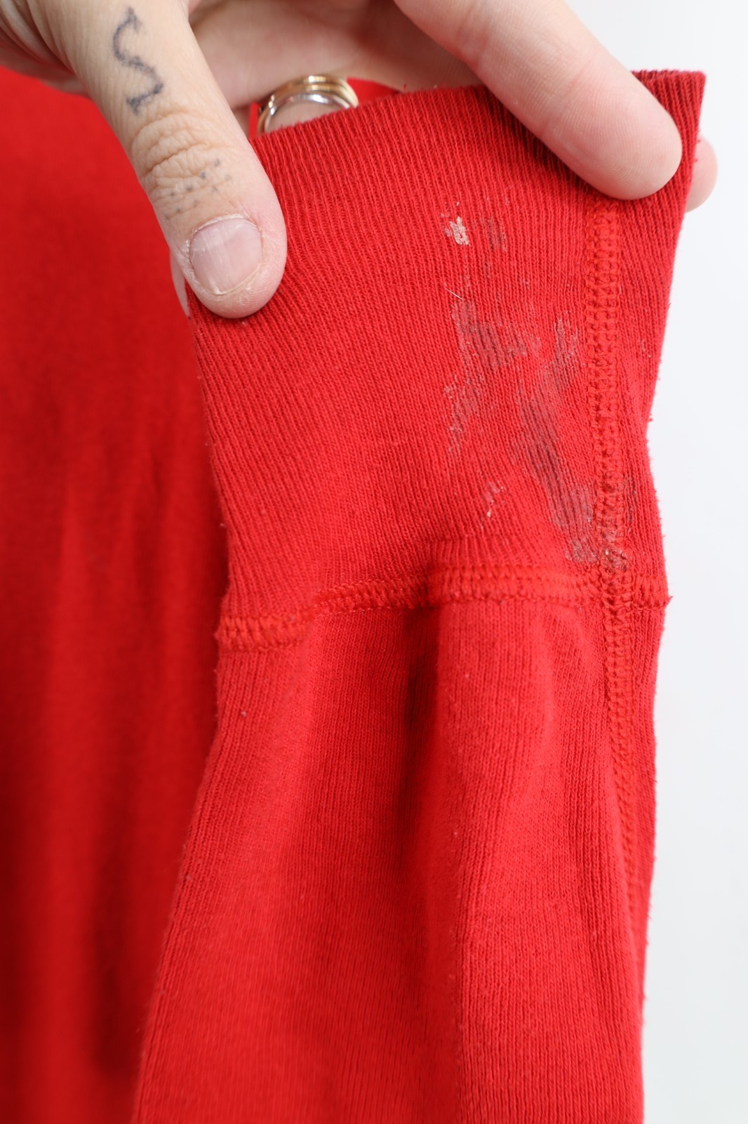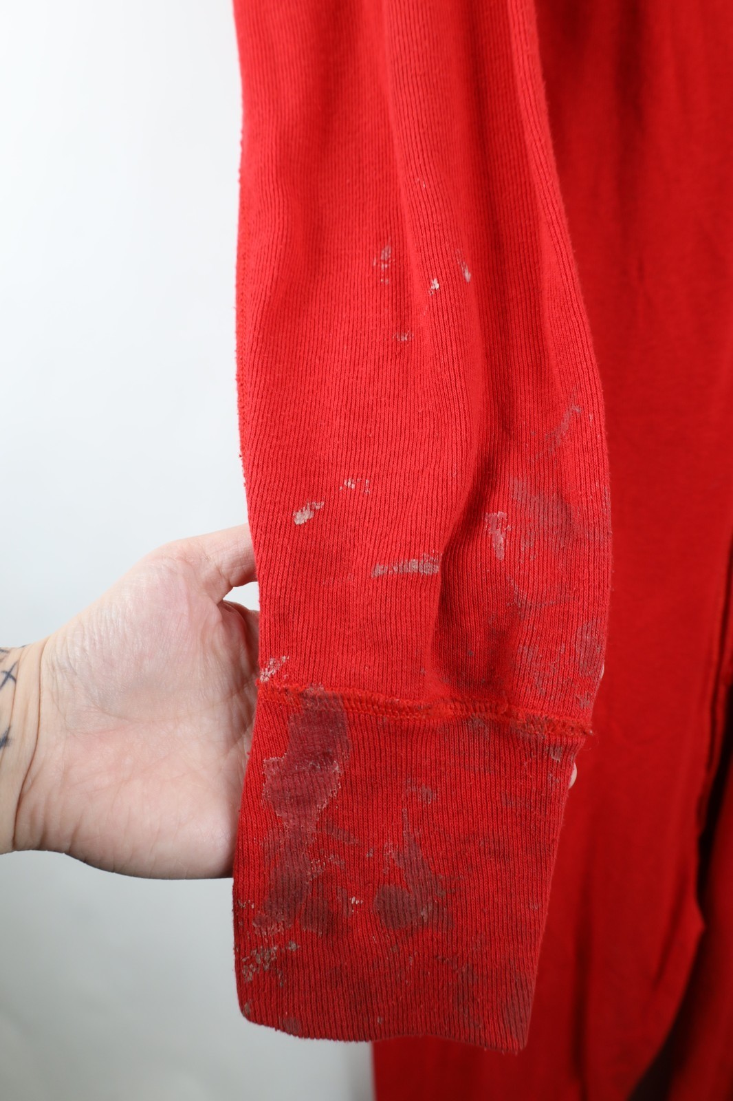 Hole left hand cuff, middle back. Stains throughout, and cuffs. Seams distressed. Collar, cuffs discolored. Color faded. Pilling