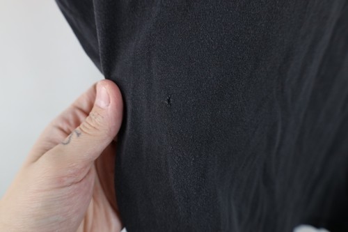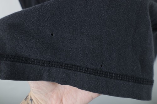 Holes front, side slits. Dark spots/blemsihes front, back. Loose threads arms. Collar, arms discolored. Color faded. Pilling