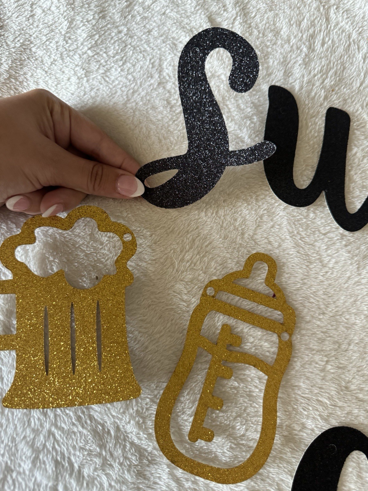 Black 'Super Dad' Banner with gold beer mug and baby bottle designs. Perfect for Father?s Day party. Comes with gold ribbon to hang the letters.