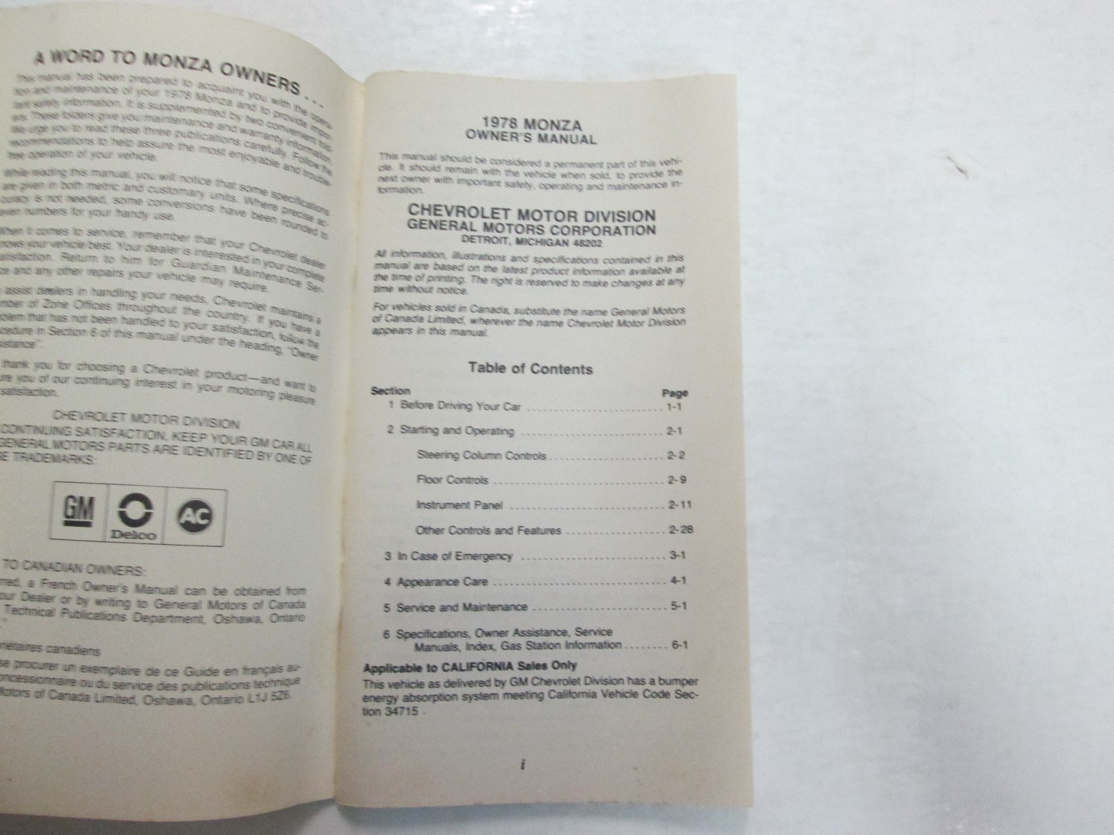 1978 MANUALE DI SICUREZZA OPERATIVA MANUALE DI CHEVROLET MONZA MANUTENZIONE MANUINE