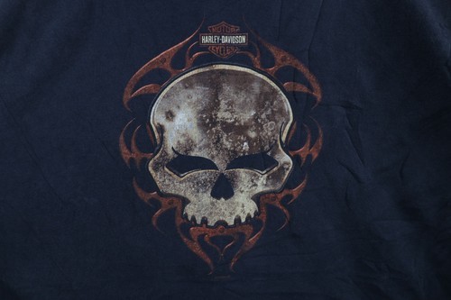 Vintage Y2K 2004 Harley Davidson Mens 2XL Faded Spell Out Tribal Skull T-Shirt