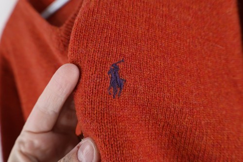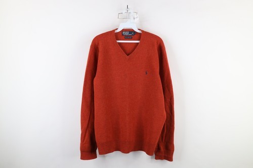 Vintage 90s Ralph Lauren Mens Large Blank Lambswool Knit V-Neck Sweater Orange