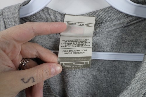 Hole near collar. Blemishes front. Armpits discolored. Graphics distressed