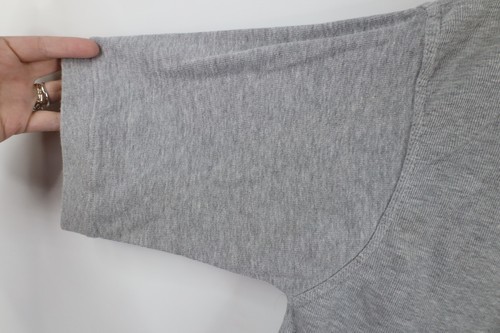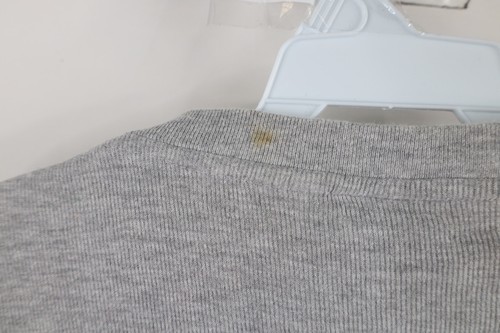 Design distressed. Stain back of collar. Color faded. Armpits discolored