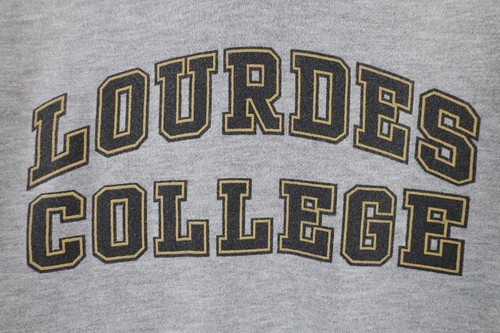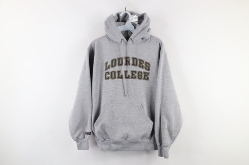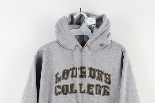 Vintage Mens Small Faded Spell Out Lourdes University Hoodie Sweatshirt Gray