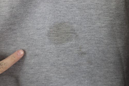 Stains front, pocket, back, left arm. Cuffs discolored. Graphics faded. Color faded