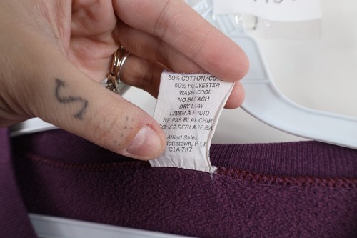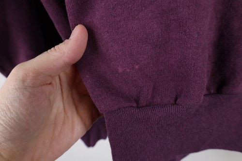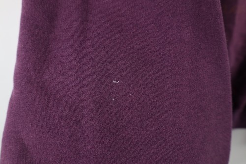 Stains front, back, arms, right cuff. Graphics faded. Discolored and color faded