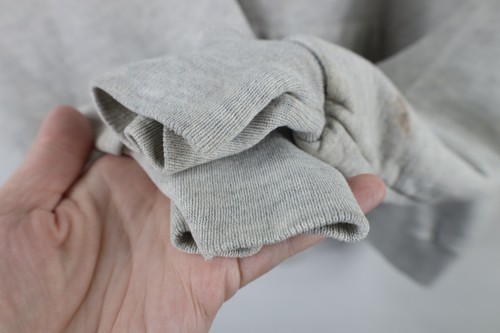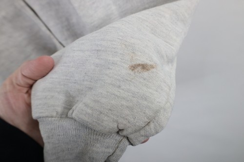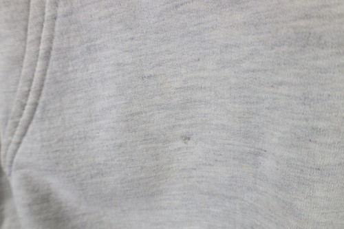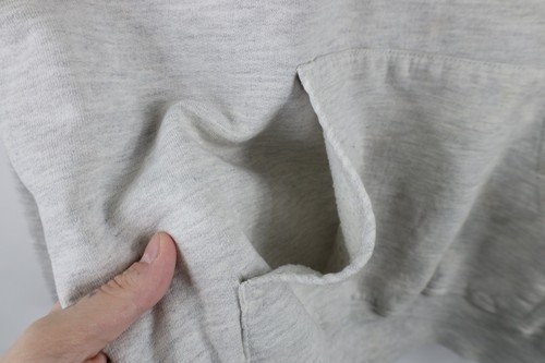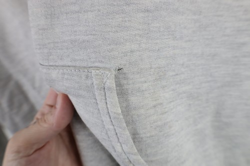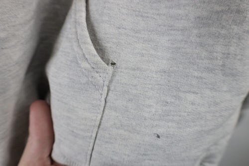 Holes in pockets corners. Blemishes throughout. Pilling and discoloration inside hood.