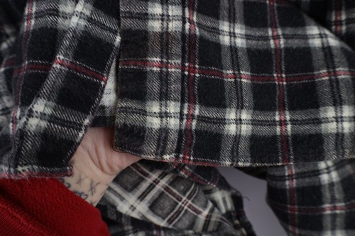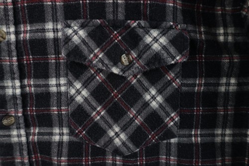 Missing right pocket button. Stain front bottom. Cuffs and collar discolored. Color faded. Has pilling