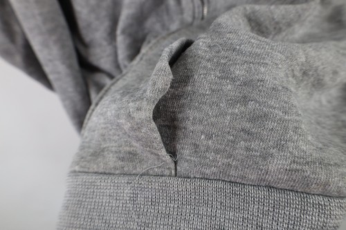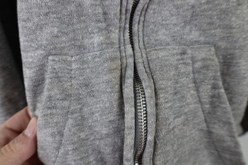 Zipper pull broken. Still zips. Blemish front bottom. Pocket corners loose. Cuffs blemished and frayed. USA made