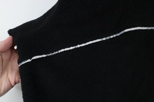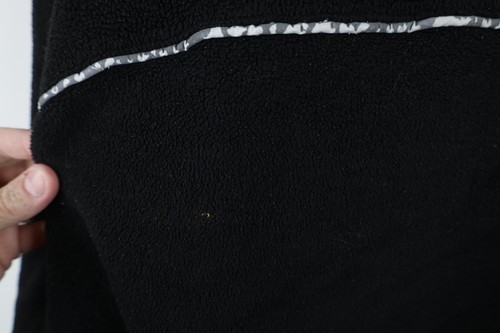 Reflective strips front, back, collar peeling. Stain front bottom, back. Fleece matted, color faded. Has pilling, material stuck to fabric. Zipper pull frayed