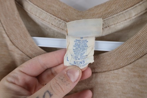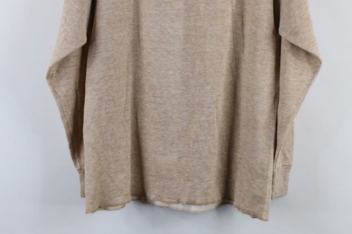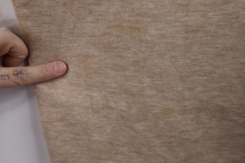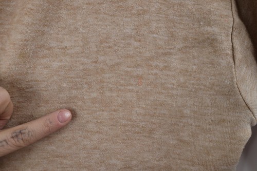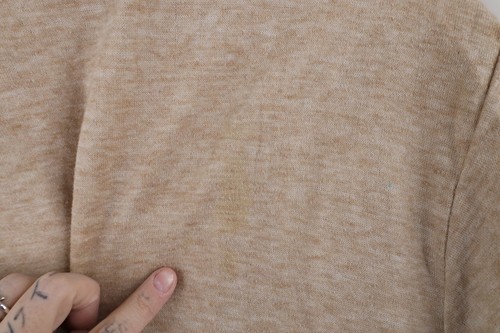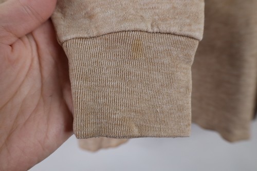 Blemish front, back, and cuffs. Pilled. Fabric pulls. Bottom hem frayed. USA made