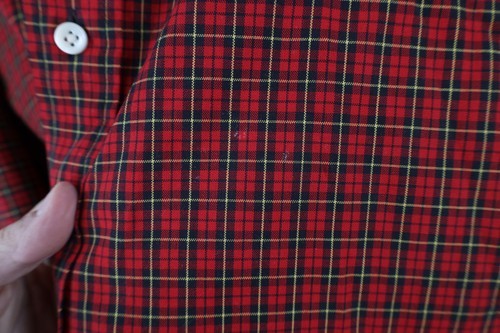 Blemishes front middle and back bottom, right arm. Collar discolored.
