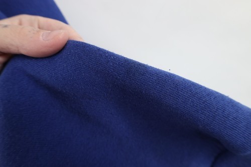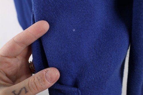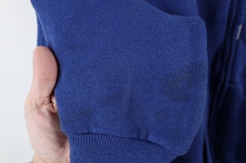 Stains front, arms/cuffs. Color faded. Has pilling. USA made
