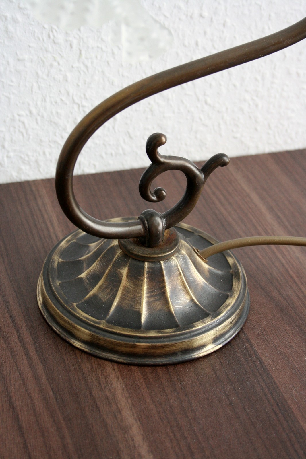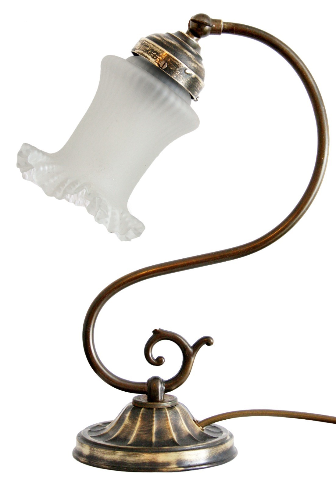 Great original Art Nouveau bedside lamp around 1920. Beautiful brass base with noble, dark patina. Height overall approx. 35 cm. Flowers of glasses modern! Caustic matt, corrugated edge. Complete electrics and small parts from the specialist renews German standard version. Brass-colored supply line, cord intermediate switch.