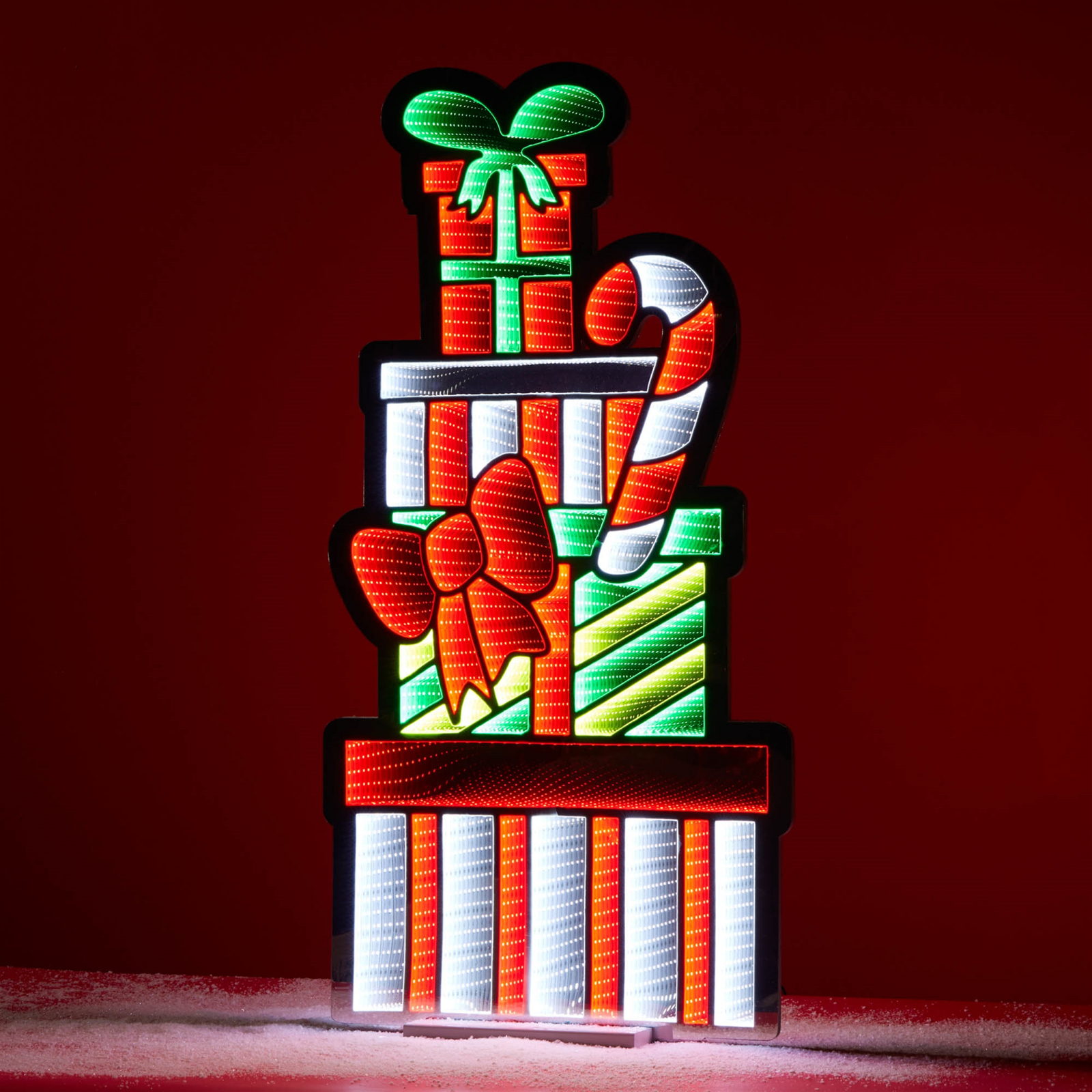 Festive Holiday Design: Features a vibrant stack of gift boxes paired with a classic candy cane for joyful seasonal d cor. Durable Acrylic Construction: Weather-resistant acrylic ensures longevity and bright illumination year after year. Plug Go UL plug-in design for easy setup just plug it in and enjoy the illuminated ambiance. Suitable for indoor use only.