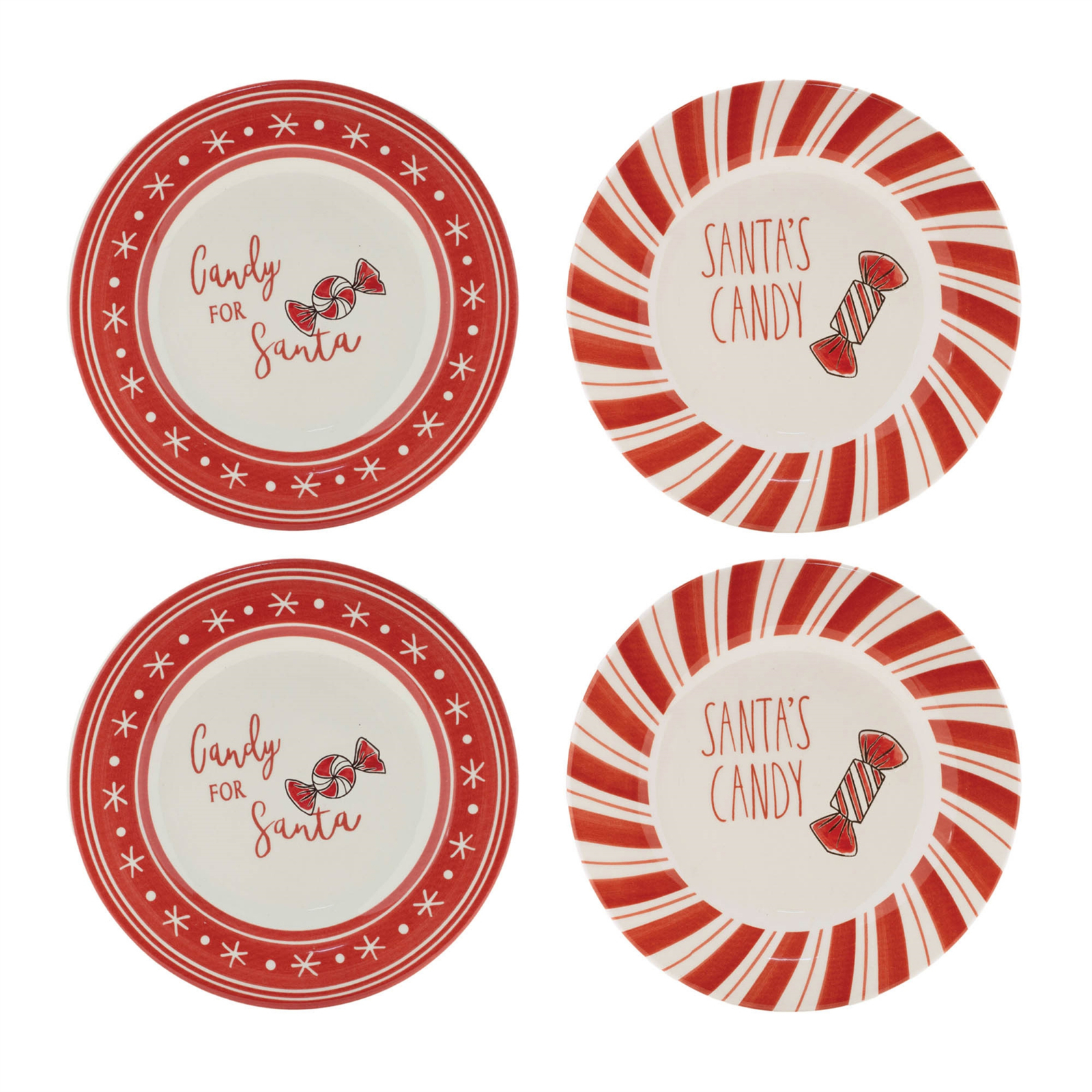 Serve up sweet holiday treats with this Ceramic Santa Candy Plate Set. Featuring two festive designs one with classic red and white stripes and the other adorned with snowflakes and peppermint candy accents these plates bring cheerful charm to your Christmas celebrations. Perfect for setting out Santa s milk and cookies on Christmas Eve or sharing holiday candies with guests. Sold in a set of four with two assorted designs to mix and match for a fun and festive tabletop display.