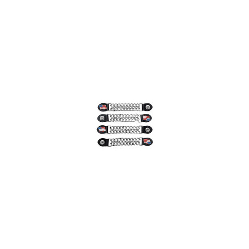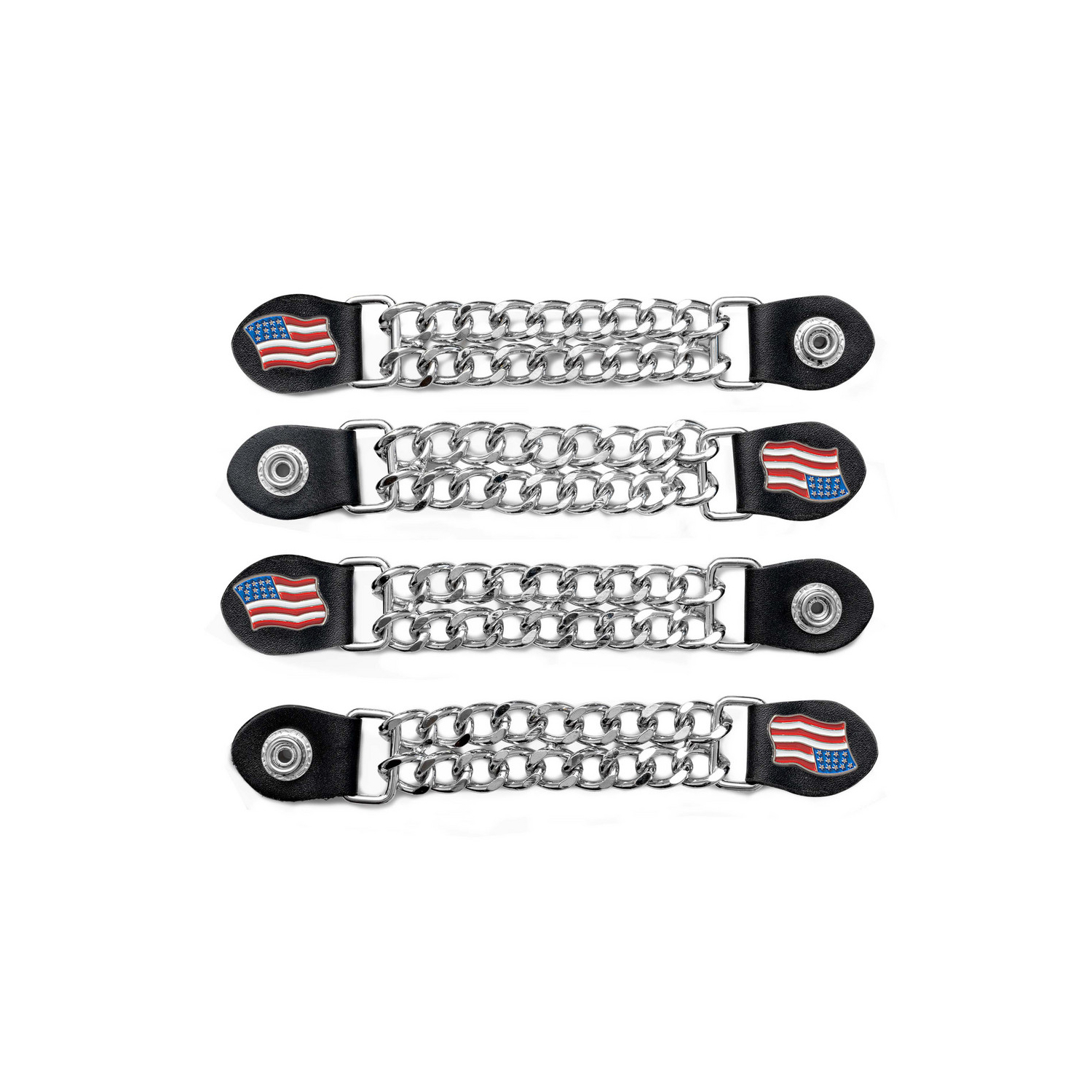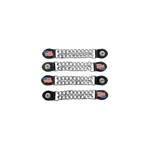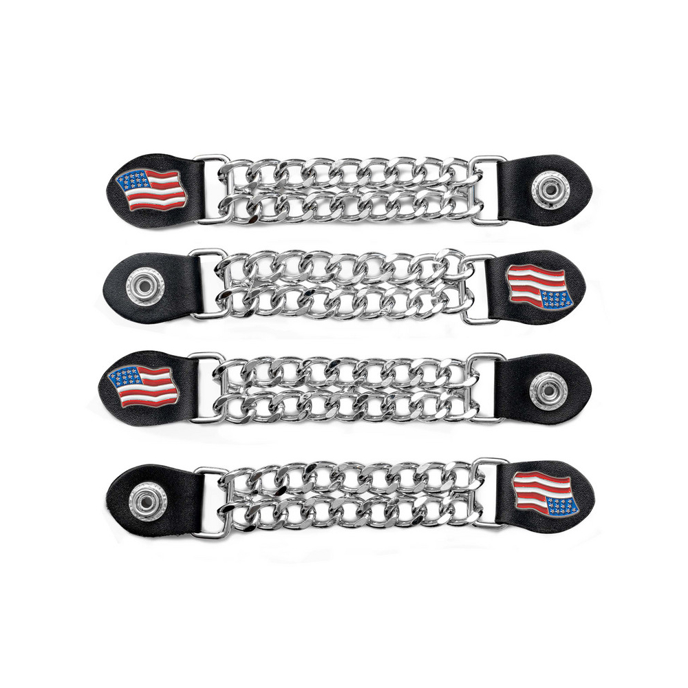 Inject an element of comfort and style into your road gear. These vest extenders showcase unique designs while you get a bit more breathing room out of your garment. Includes: 4pc faux leather and chrome chain extender with USA Flag medallions. Measures 6-1/2 x 1 . Not sold individually.