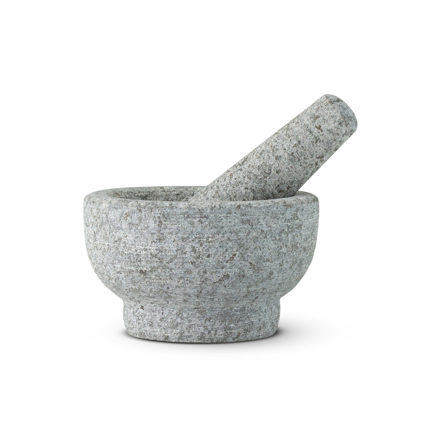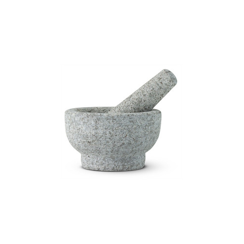 Use the Granite Mortar and Pestle during meal prep a?? the fresh flavors and oils of freshly ground spices make a big difference in the taste of the food! Heavyweight construction of gray solid granite stone weighs approx. 5 pounds Mortar measures 5-1/8 diameter x 3-1/4 , with 5-1/8 Pestle Excellent gift idea for the newlyweds, a housewarming gift, or any serious cook on your gift list. Gift boxed. Limited Lifetime Warranty.