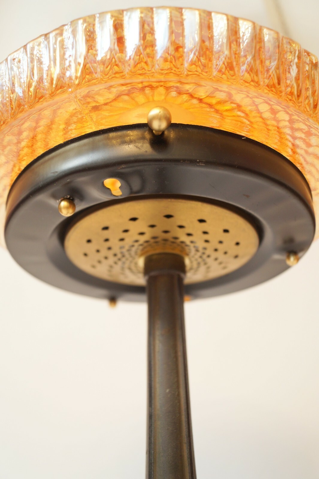Super unique de notre usine d'eclairage uniquement disponible ici. Equipement de laiton Art deco classique original, env. 1930 avec fantastique patine antique. NOUVEAUX-TEMPS, LUMINAIRE IRIRDIE IRIDIE ET ??UMIERE. Hauteur totale d'env. 35 cm, diametre du parapluie env. 25 cm. Completer une nouvelle installation electrique. Ligne d'alimentation en PVC avec Switch Intermediate Switch.E27 Version en laiton, jusqu'a Max. 60 watts - Nous recommandons fortement les lampes LED! De petites pieces telles que des vis ou des rondelles ont ete renouvelees.