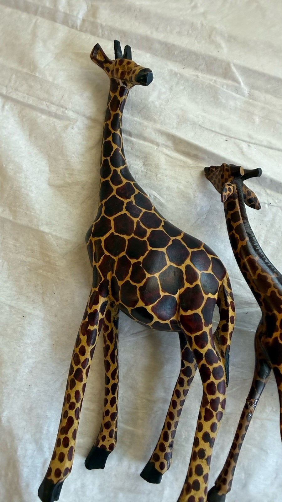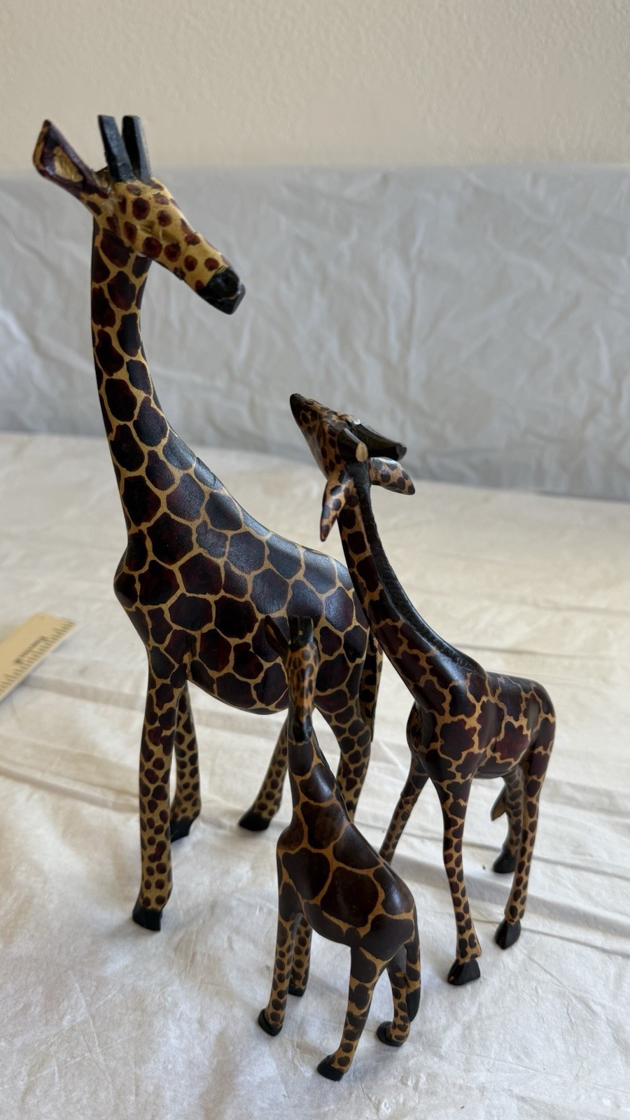 Ears are damaged This product is a set of three vintage handcrafted wood giraffe figurines in different sizes: 12?, 9?, and 6?. Each figurine is intricately crafted by hand, showcasing the uniqueness and artisanal touch of each piece. Made from wood, these figurines capture the essence of wild animals, specifically giraffes, with their detailed craftsmanship. Ideal for collectors or nature enthusiasts, these figurines add a touch of charm and nostalgia to any space.