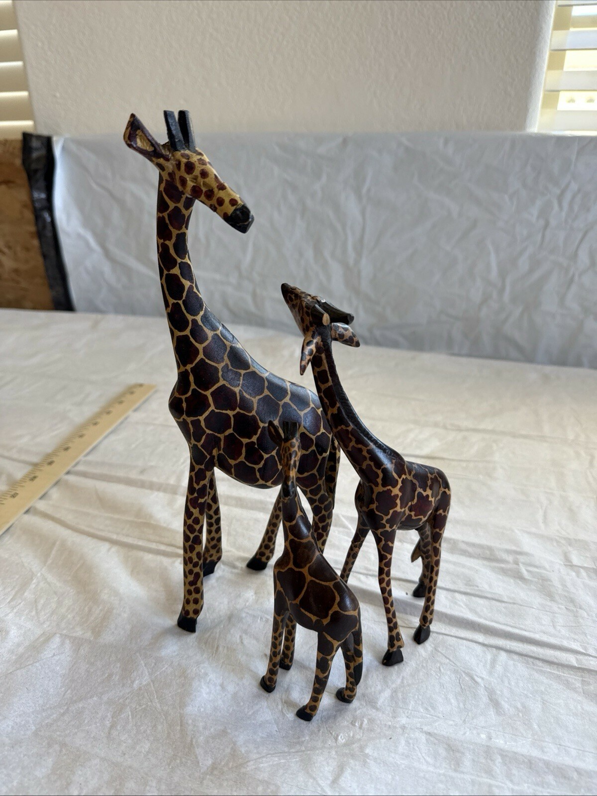 LOT OF 3 VINTAGE WOOD HAND-CRAFTED GIRAFFE Statues Figurines 12” 9” 6” W Defect