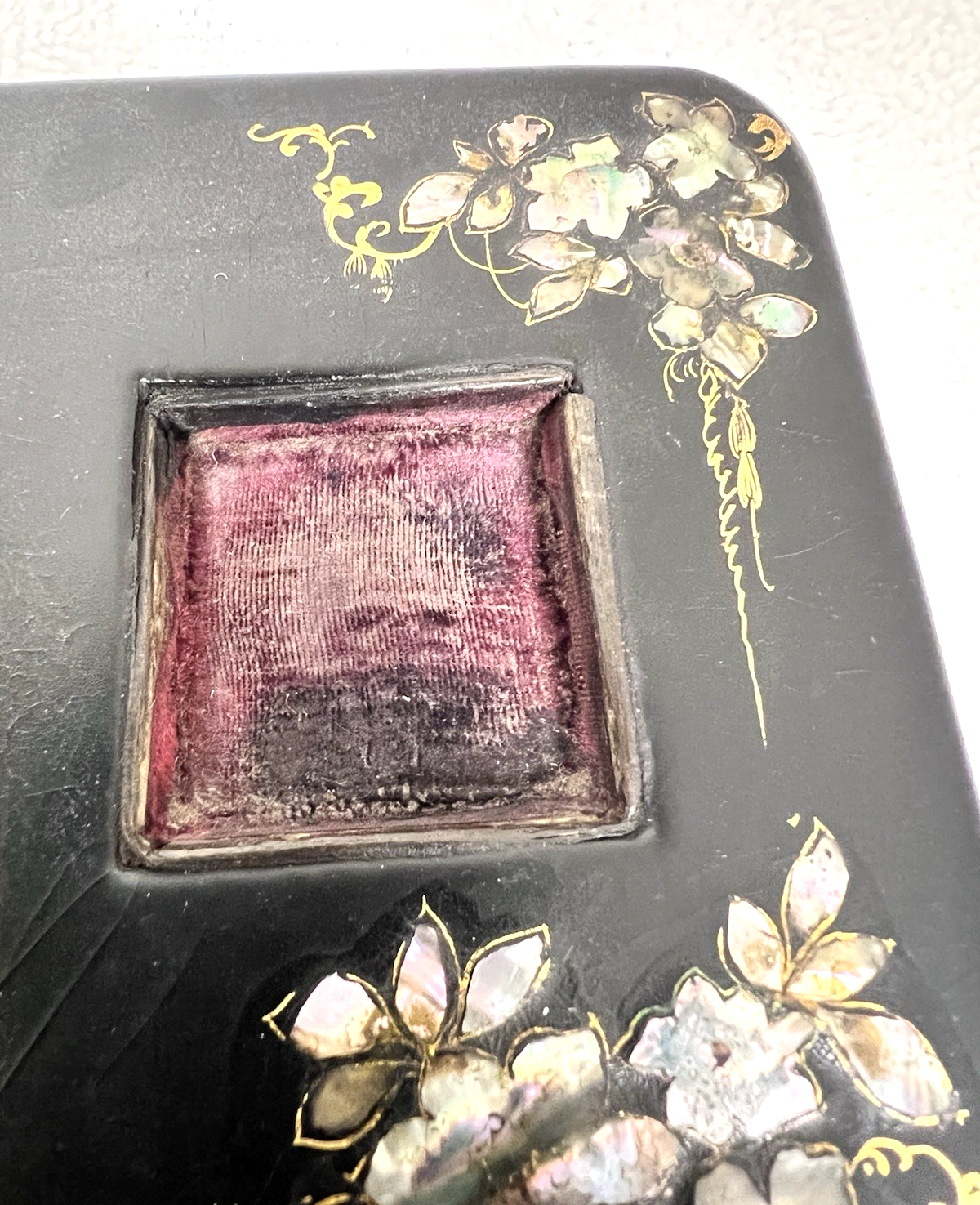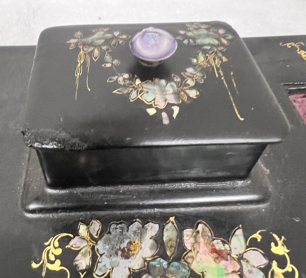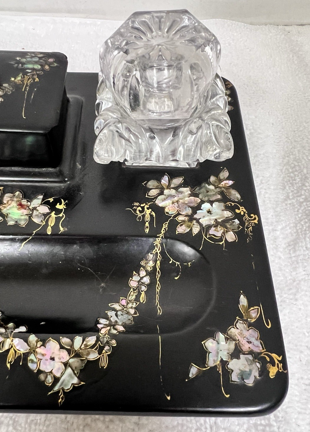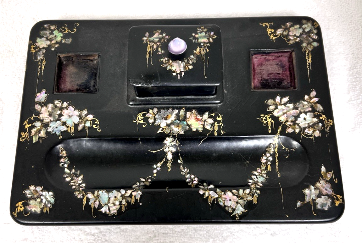 Victorian Lacquerware w Abalone Shell Double Inkwell Stand Floral Garland asis the base measures 10 x 7 inches and has sweet bun feet. the lidded box is for nibs and 3 of the corners have mall chips off them but being black lacquerware, you only really notice it when in hand or up close. The glass wells are thick clear glass, and one has a small under chip on a corner, and one corner has a side chip that is part of the corner oval on the same inkwell. There is crackling to the black which is normal to lacquerware it is sold as is no returns please ask if you want/need a photo of something closer up.