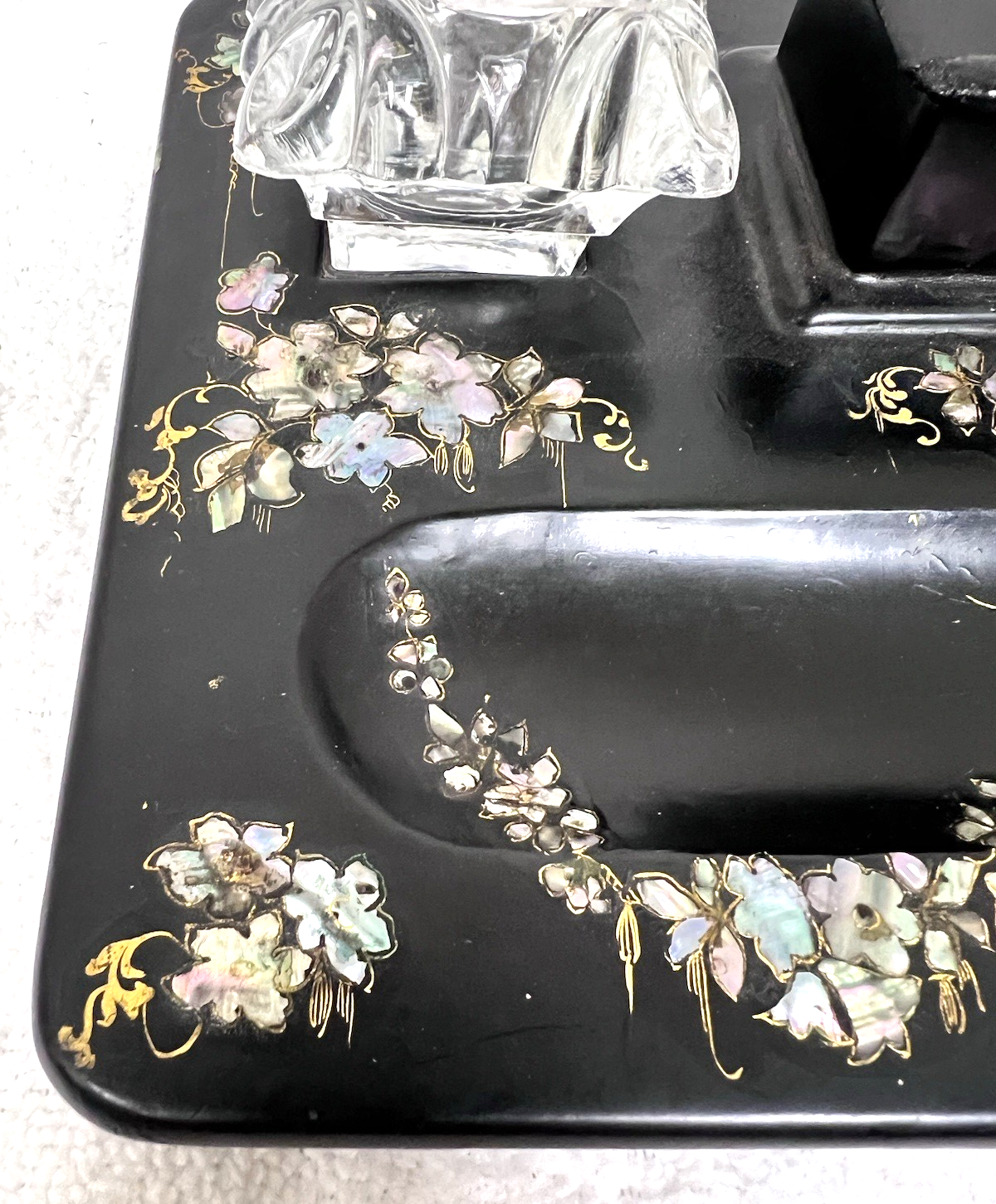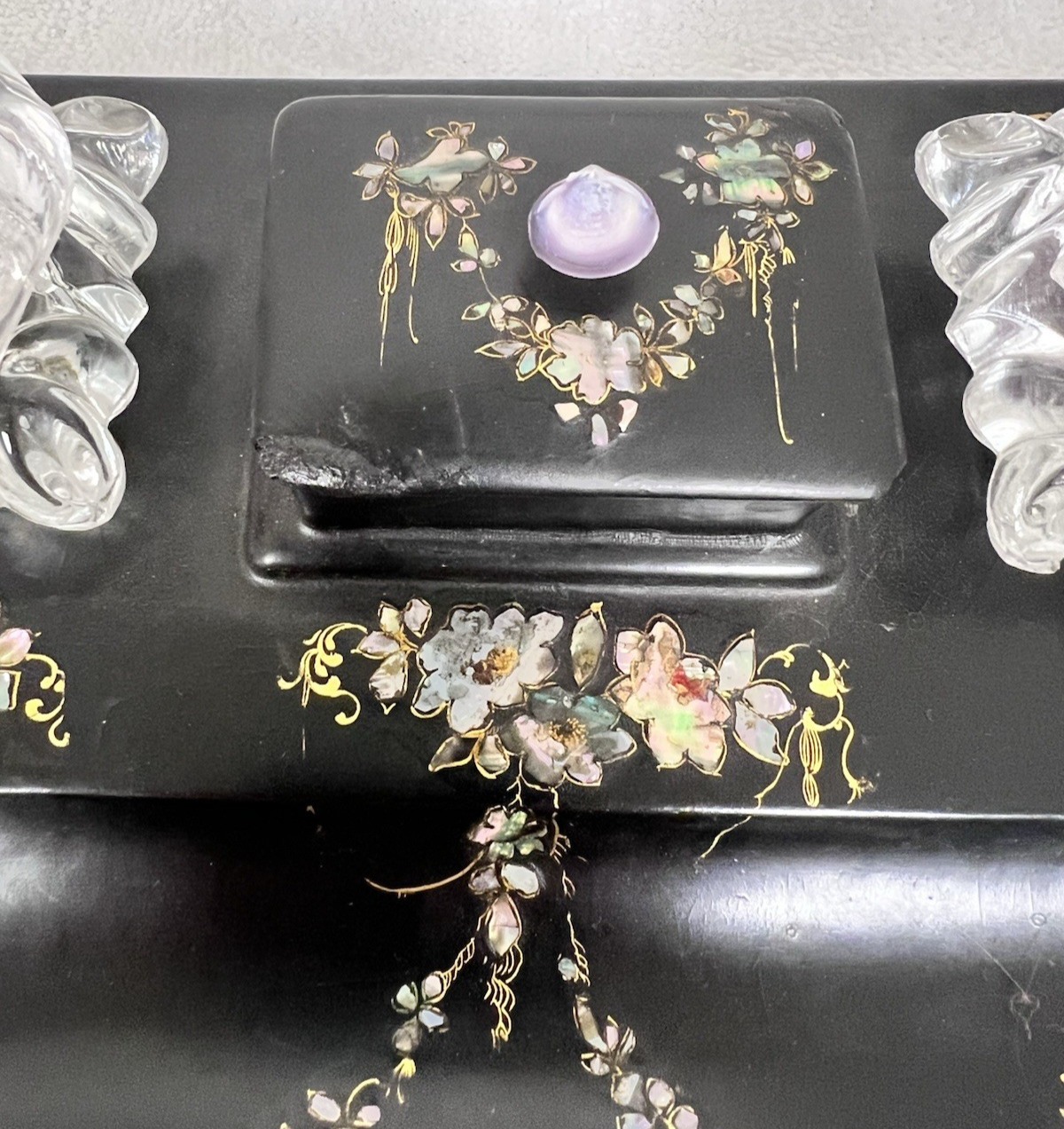 Victorian Lacquerware w Abalone Shell Double Inkwell Stand Floral Garland asis