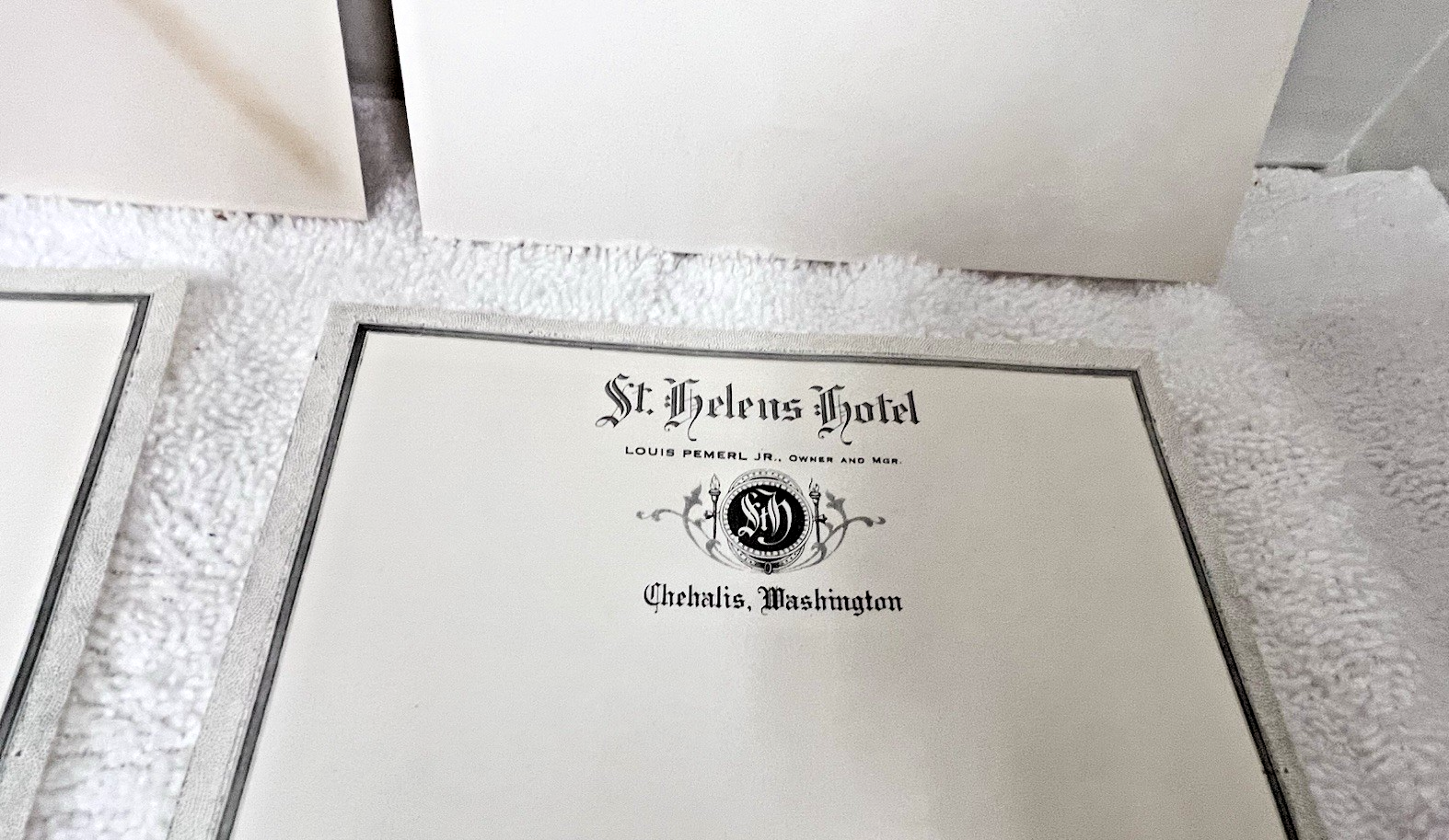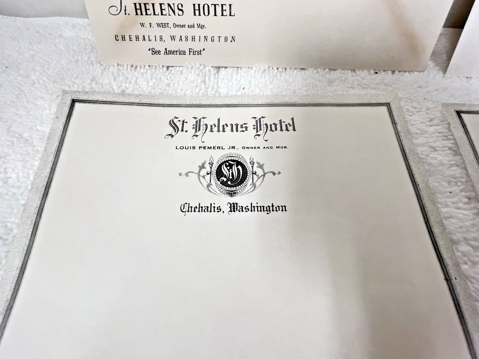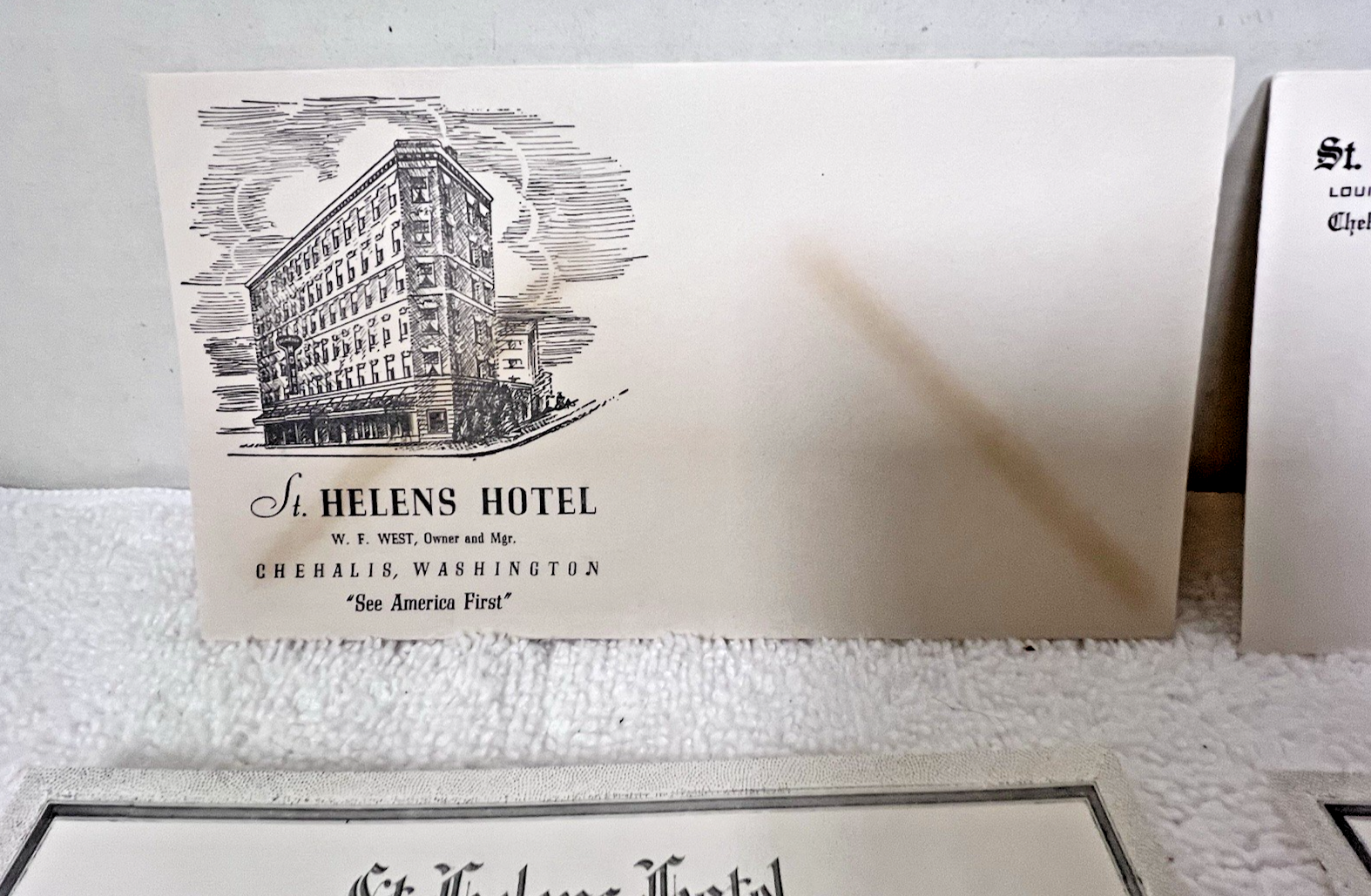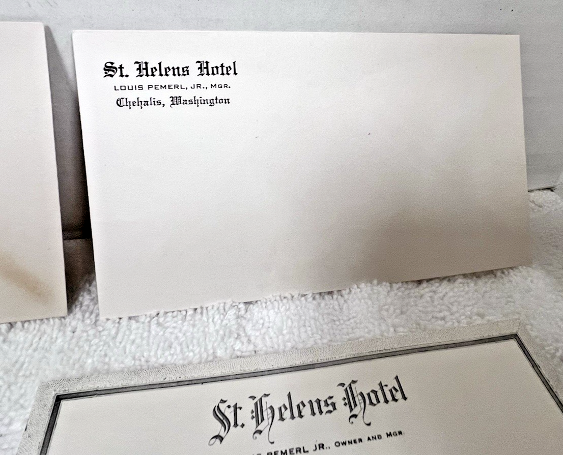 Victorian Era 4PC St. Helens Hotel Chehalis Washington 2 Diff Envelopes L Pemerl Jr Owner and Manager 1 envelope has some yellowing see the lines...also some finger wrinkles nothing deep