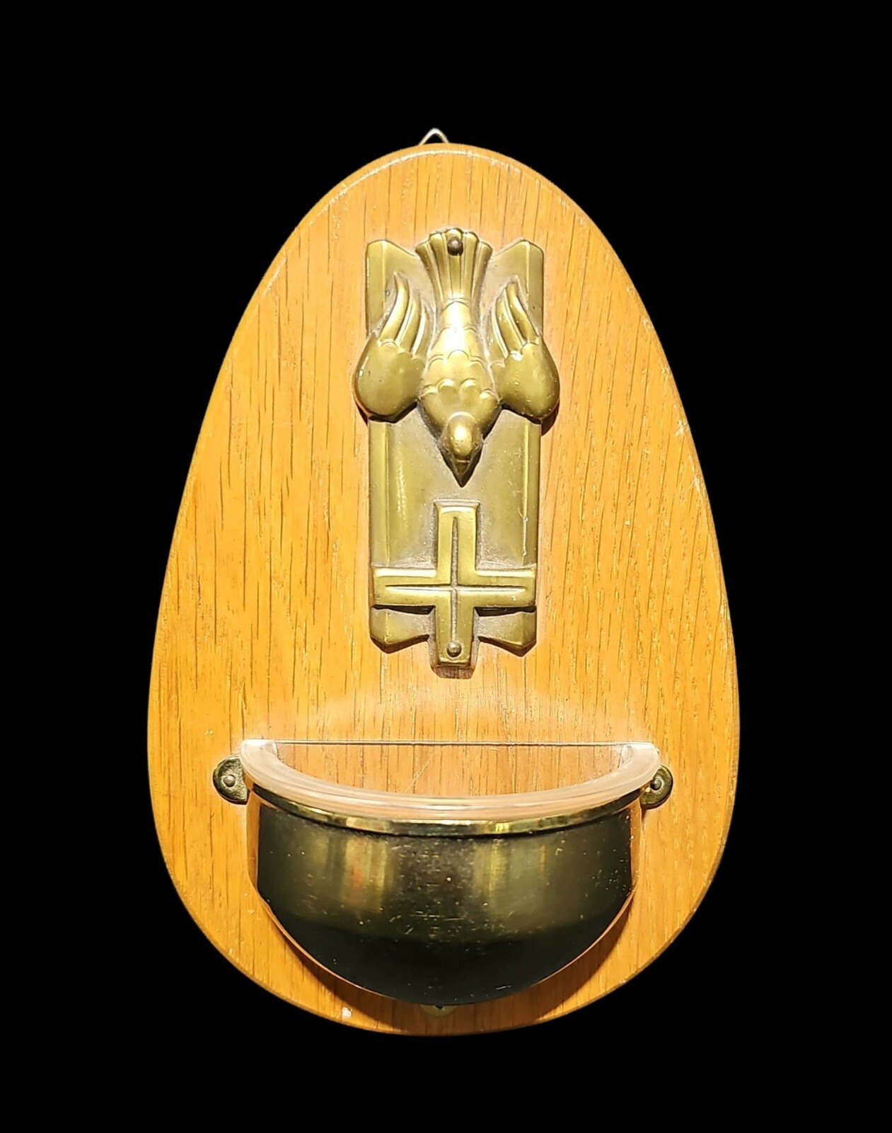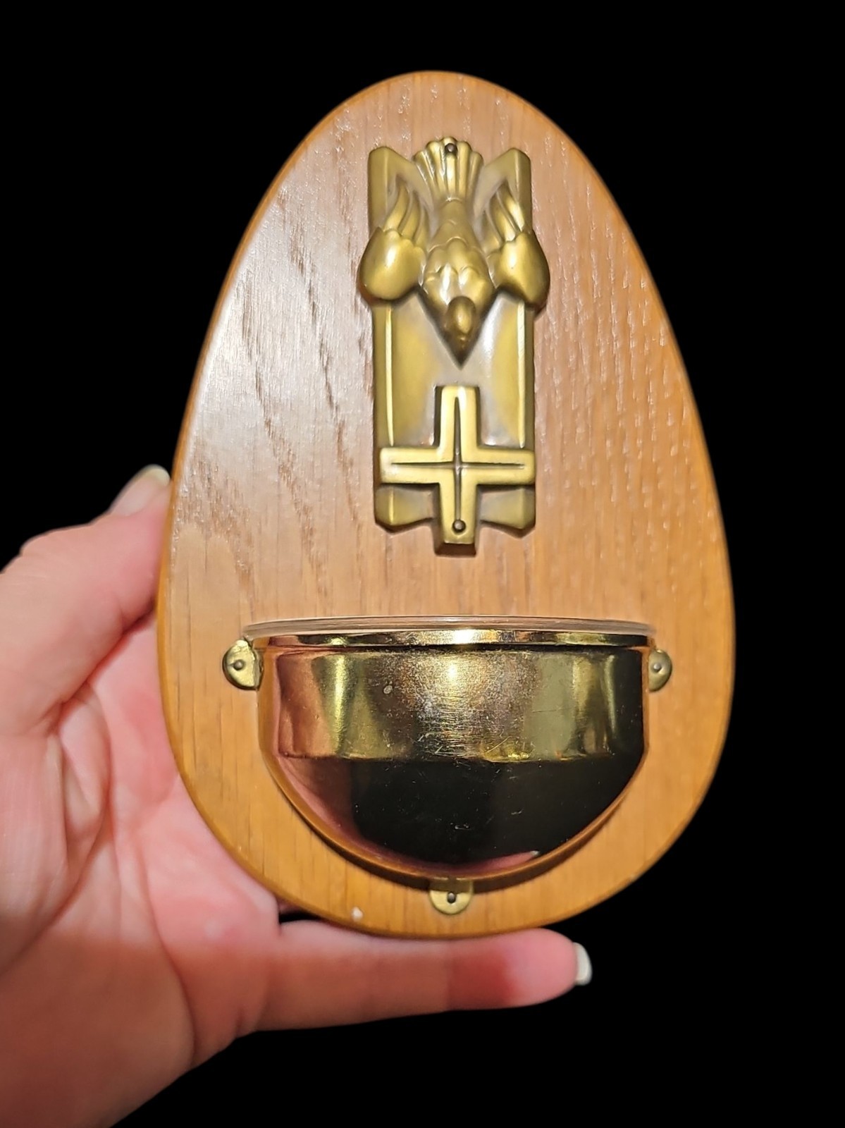 UP FOR SALE: Vintage holy water font by Goldscheider, Germany. Features a brass dove symbolizing the Holy Spirit, mounted above a cross, with a removable plastic water bowl on a wood backplate.