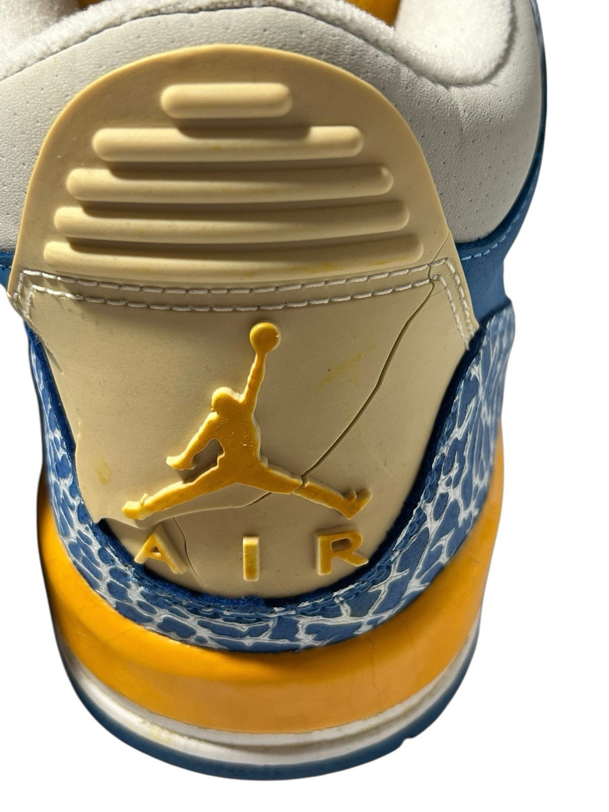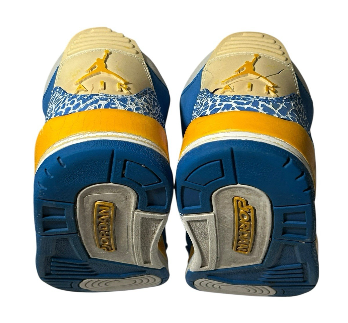 The back part of the shoe which has the heel logo Jumpman on one is cracking and on the other has cracked near the top and partly pulled off. This is very common on these. Other than that, these are in very nice condition!