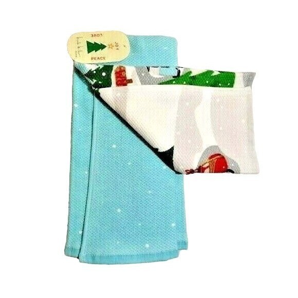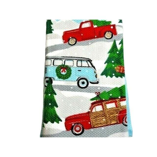 Each towel features a wintry scene and red vintage truck, Travel Van, and a retro Woody Station Wagon all carrying Christmas Trees.
