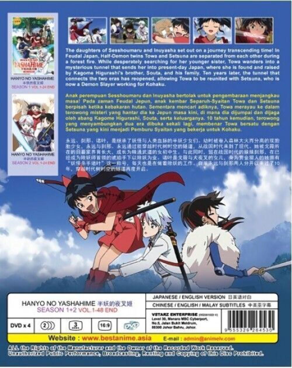 body { font-family: "Market Sans", Arial, sans-serif; } For detail of this set please view below only, and also to tell if this set has english or Japanese audio view below and check out the listing photo back side. If it shows as (Japanese / English Version means it has English audio but if it only shows Japanese Version no English Audio)All our set has at less English Subtitles if only Japanese audio. This set is all regions. ANYO NO YASHAHIME SEASON 1+2 VOL.1-48 END DVD Title Name ANYO NO YASHAHIME SEASON 1+2 VOL.1-48 END No of Disc 4 Disc (48 Episodes) Version English / Japanese Subtitles Chinese / English/ Malay Format DVD / NTSC All Region Code (16:9) STORY : The daughters of Sesshoumaru and Inuyasha set out on a journey transcending time! In Feudal Japan, Half-Demon twins Towa and Setsuna are separated from each other during a forest fire. While desperately searching for her younger sister, Towa wanders into a mysterious tunnel that sends her into present-day Japan, where she is found and raised by Kagome Higurashi's brother, Souta, and his family. Ten years later, the tunnel that connects the two eras has reopened, allowing Towa to be reunited with Setsuna, who is now a Demon Slayer working for Kohaku. But to Towa's shock, Setsuna appears to have lost all memories of her older sister. Joined by Moroha, the daughter of Inuyasha and Kagome, the three young women travel between the two eras on an adventure to regain their missing past. We Only Sell Original/Genuine DVDs. All DVDs I'm selling are from Licensed Publisher in Malaysia. All DVDs come with Original Sealed Authenticated Sticker / Hologram by Malaysia Censorship Board. ALL PACKAGE WILL BE SHIP OUT FROM USA CA SAN DIEGO AREA OCEANSIDE, SAN MARCOS. THIS MEAN WITH IN USA YOU SHOULD RECEIVE THE PACKAGE WITH IN 4-6 BUSINESS DAY AFTER SHIP OUT. We Only Sell Original/Genuine DVDs. All DVDs I'm selling are from Licensed Publisher in Malaysia. All our products are All region so it will play any dvd player in the world Any problem please contact us first so we can speed up taking care of you.