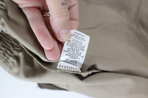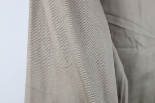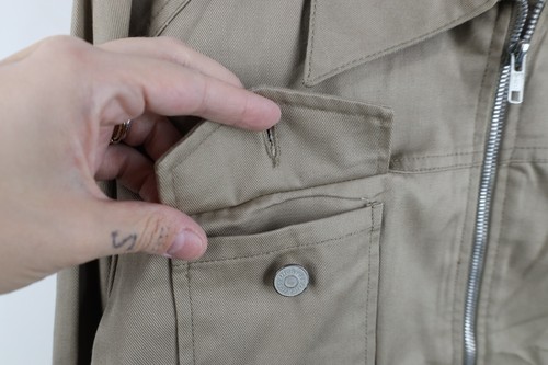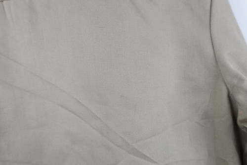 Blemish top left pocket. Dark spots/blemishes back, left arm. Collar, cuffs discolored. Color faded. Pilling. Seams distressed