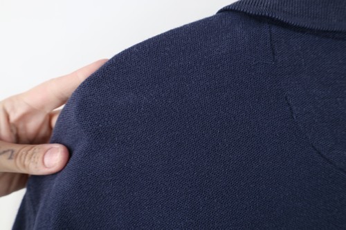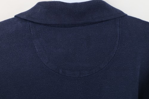 Sun faded. Loose threads by buttons. Collar, arms discolored. Blemishes/darks spots front, back. Holes side slits. Color faded. Pilling